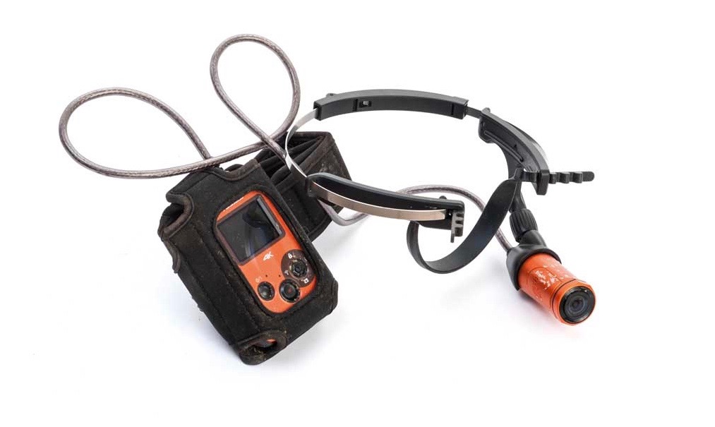 ‘Poundland Tom Cruise’ is how a friend instantly described the look of this 291g head-mounted camera. It’s an unusual one for sure. Out of the box, it only comes with one mount (and no MicroSD card), which is a metal and plastic headband that goes behind your ears. The camera clicks solidly into the left side, hanging down beside your cheek. A lead then runs between it and an armband, which holds the somewhat bulky main unit. For more strenuous sports, it has an optional rubber forehead strap.