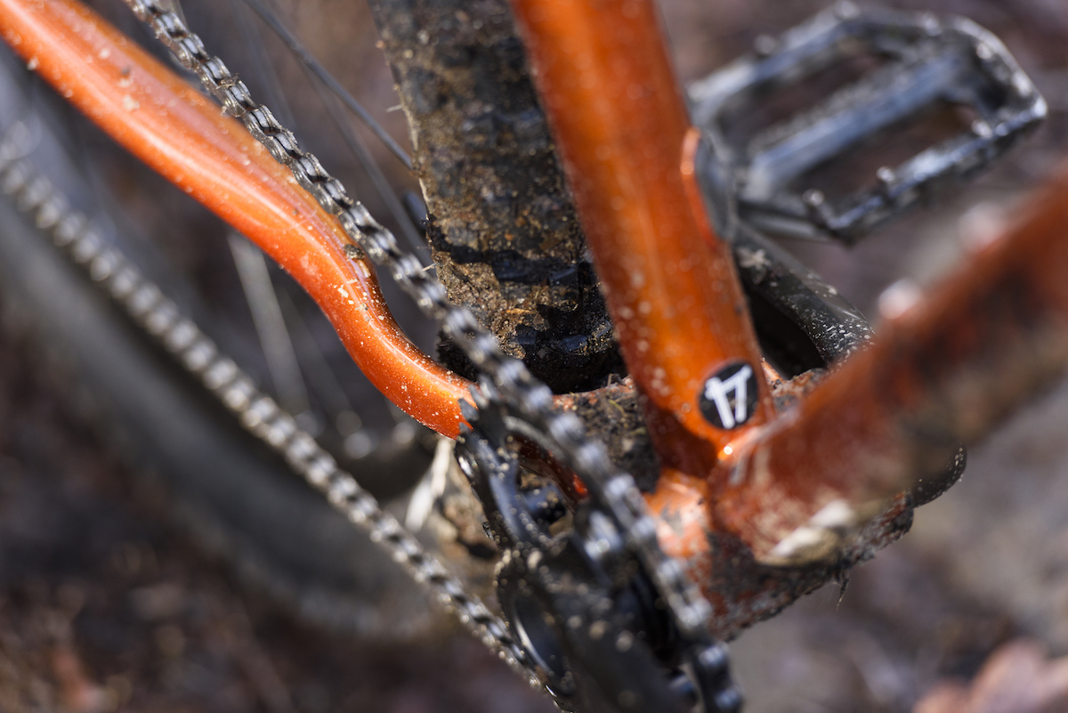 The frame is a double-butted 4130 cromoly steel job with “progressive geometry” (which I think means ‘lots of fun’), a tapered headtube, 12mm thru-axle rear dropouts which are modular so you can swap for 135mm or replace if needed, a PF30 press-fit BB shell, a rather serious-looking forged chainstay yoke that looks very roomy, even with 2.35in tyres fitted and stealth routing for a dropper post.