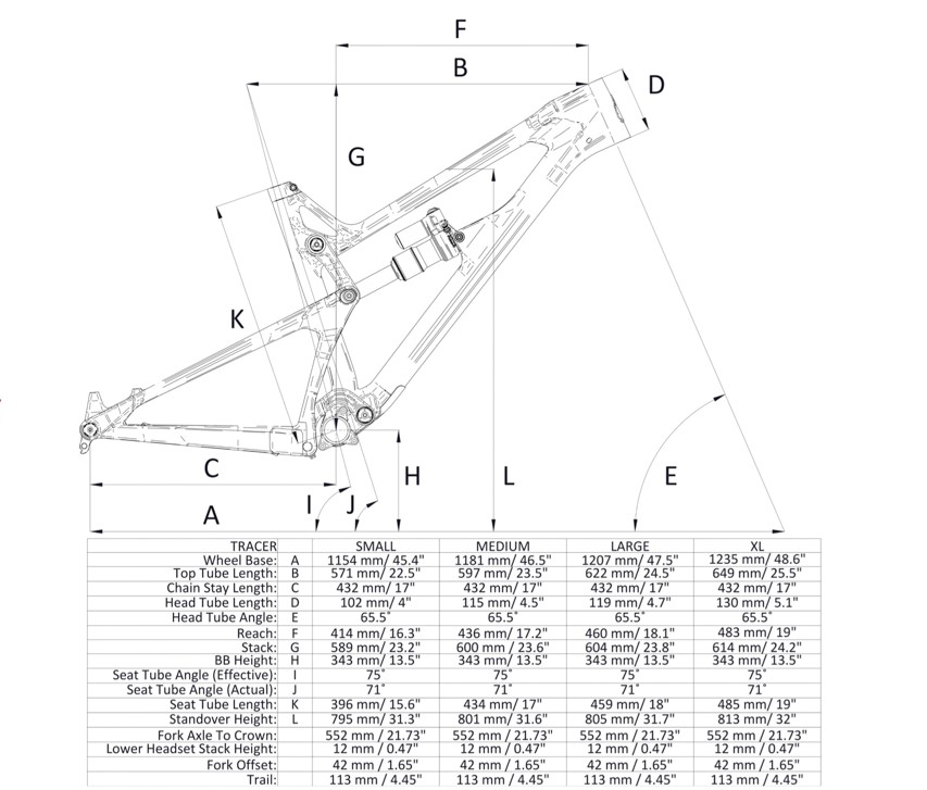 The new Tracer has a head angle that sits at 65.5°. The seat angle measures up at a nice and steep at 75°. These angles are in the right place to go up in an efficient and comfortable seated pedalling position and head down with confidence and authority.