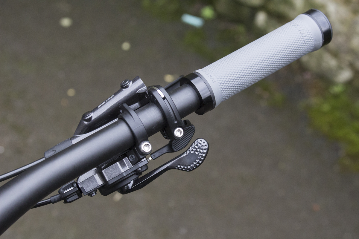 Sold separately to go with the dropper post, this is one of two remote options. The other version is for use with 1x set-ups, and sits under the bar.