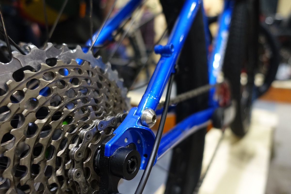 So the 142x12mm thru-axle locks down via the modular Swapout system. This allows you to run the 142x12mm thru-axle, a 135x10mm axle, or even a horizontal setup to rock as a singlespeed. Shown in the above photo however, is another option again; Boost 148x12mm. These are currently prototype, but it’s Dan Stanton’s way of adding some additional future-proofing to the existing Switchback model, so current customers can upgrade to a Boost wheelset if they want.