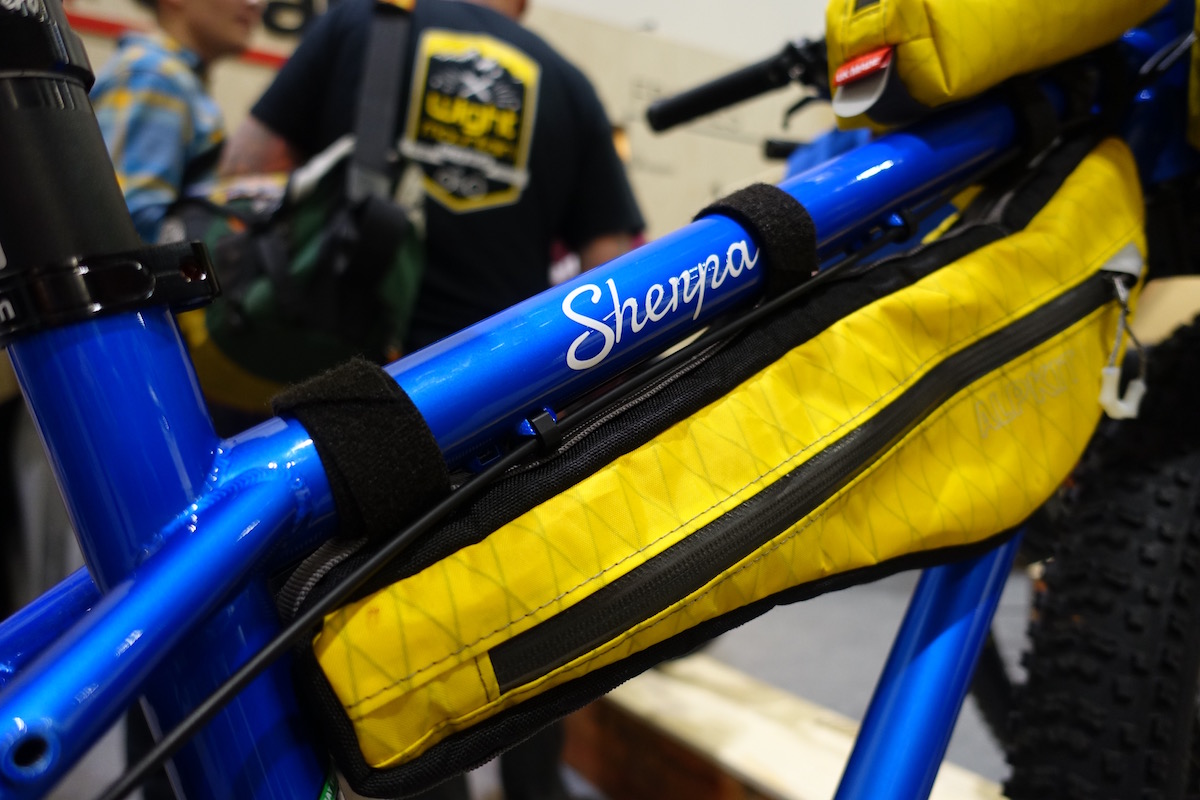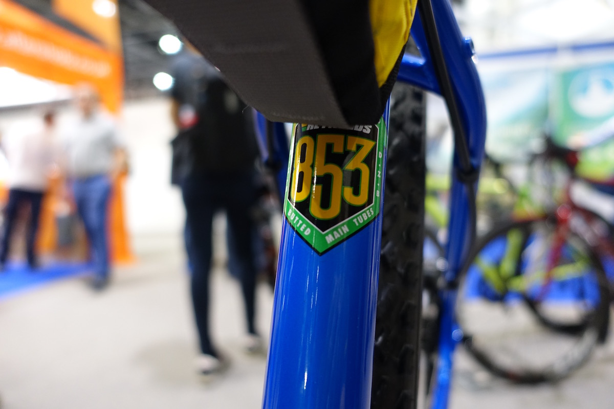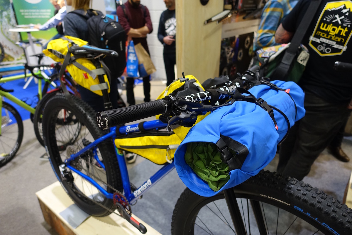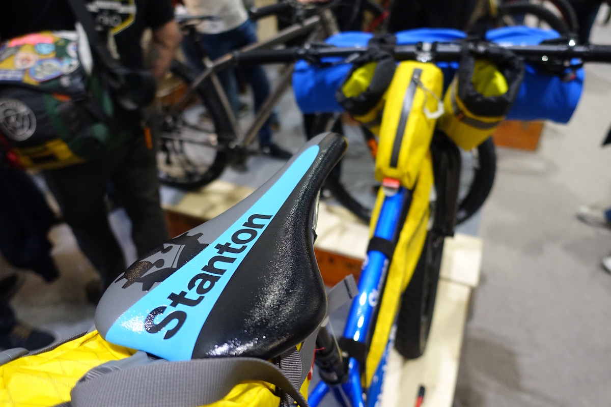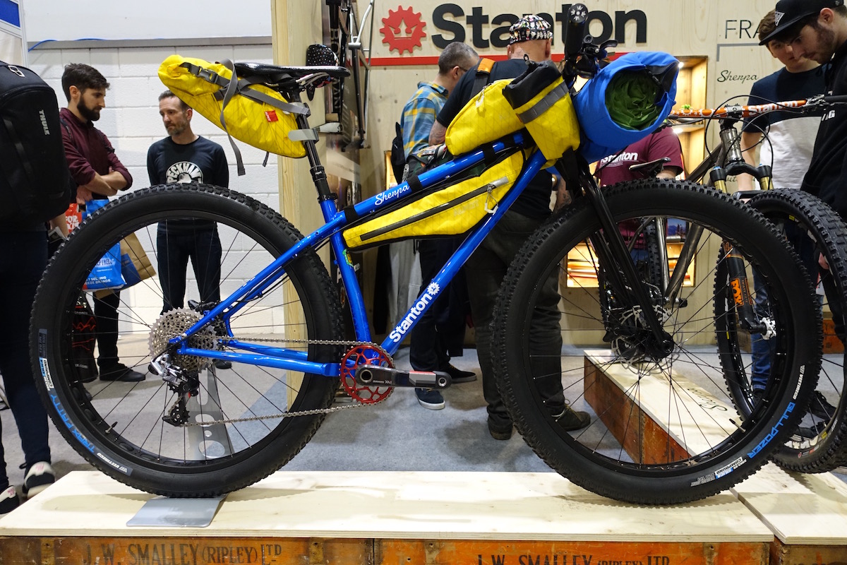 Despite having our attention caught by all the pretty frames on display, there was one bike at the Stanton booth that stood out from all the rest. With its colourful blue paintjob and chunky plus tyres, the Sherpa+ has been built as a working prototype that Stanton is currently testing. It’s built around the existing Sherpa platform, but elects for wider rubber, a rigid fork and all the necessary mounting points to bolt on all sorts of racks and bags for overnight bikepacking expeditions.
