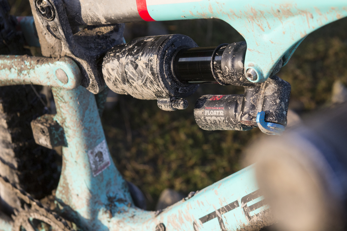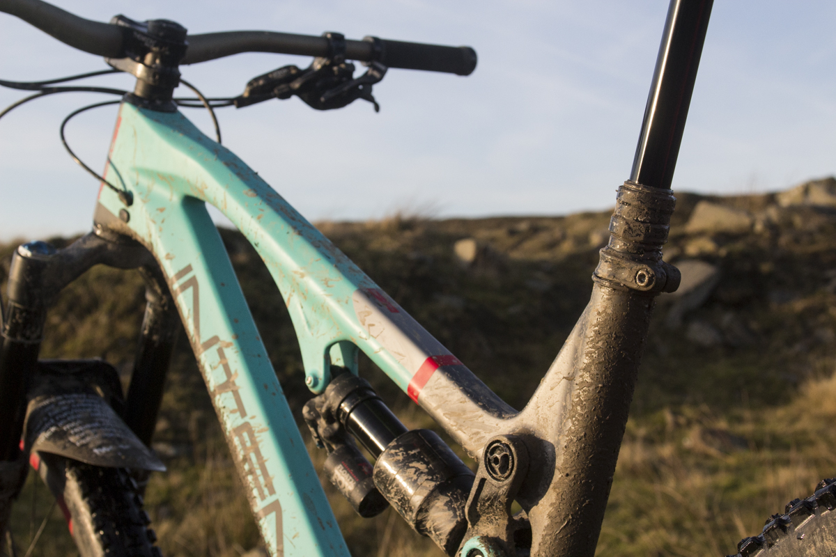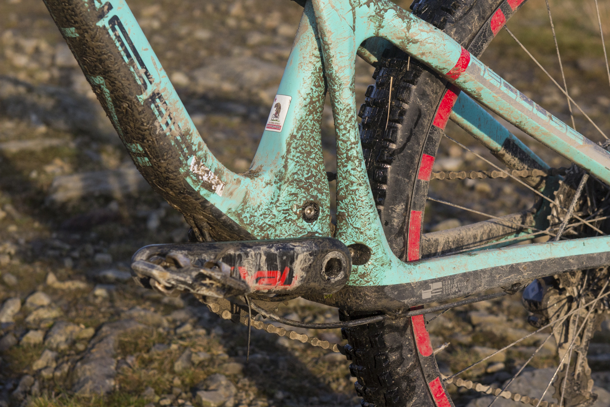 One thing to note is that mud clearance is a bit of an issue with those short chainstays. A weekend of racing up at the Tweed Valley left the rear wheel jammed up on a couple of occasions thanks to the sticky wet clay-based trails. I guess that Intense probably wasn’t thinking about gloopy British conditions during the design phase, but some additional breathing room would be much appreciated, and particularly around that lower link that’s right in the firing line. That said, I did manage to just squeeze in a Maxxis Minion DHF 2.5in tyre in the back end to confirm the max tyre clearance, but I wouldn’t recommend running a big tyre like that unless you’ve never seen mud before.