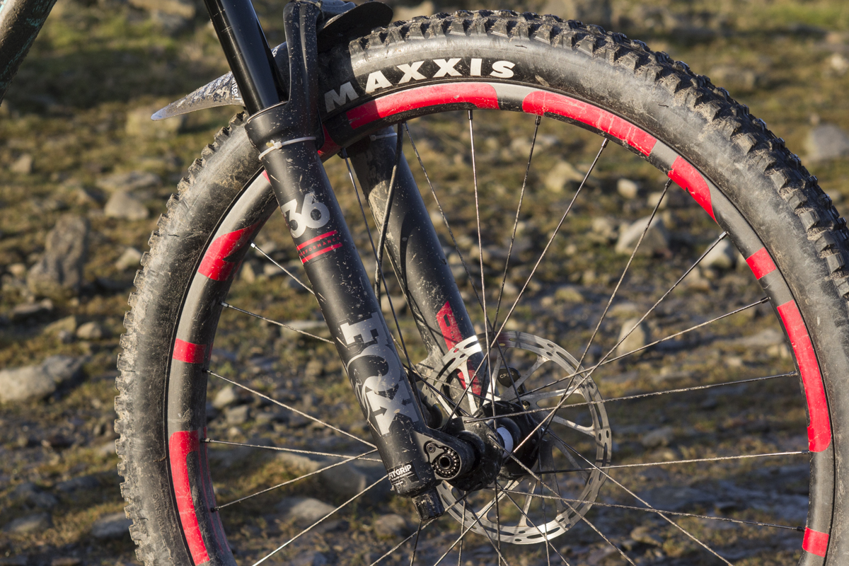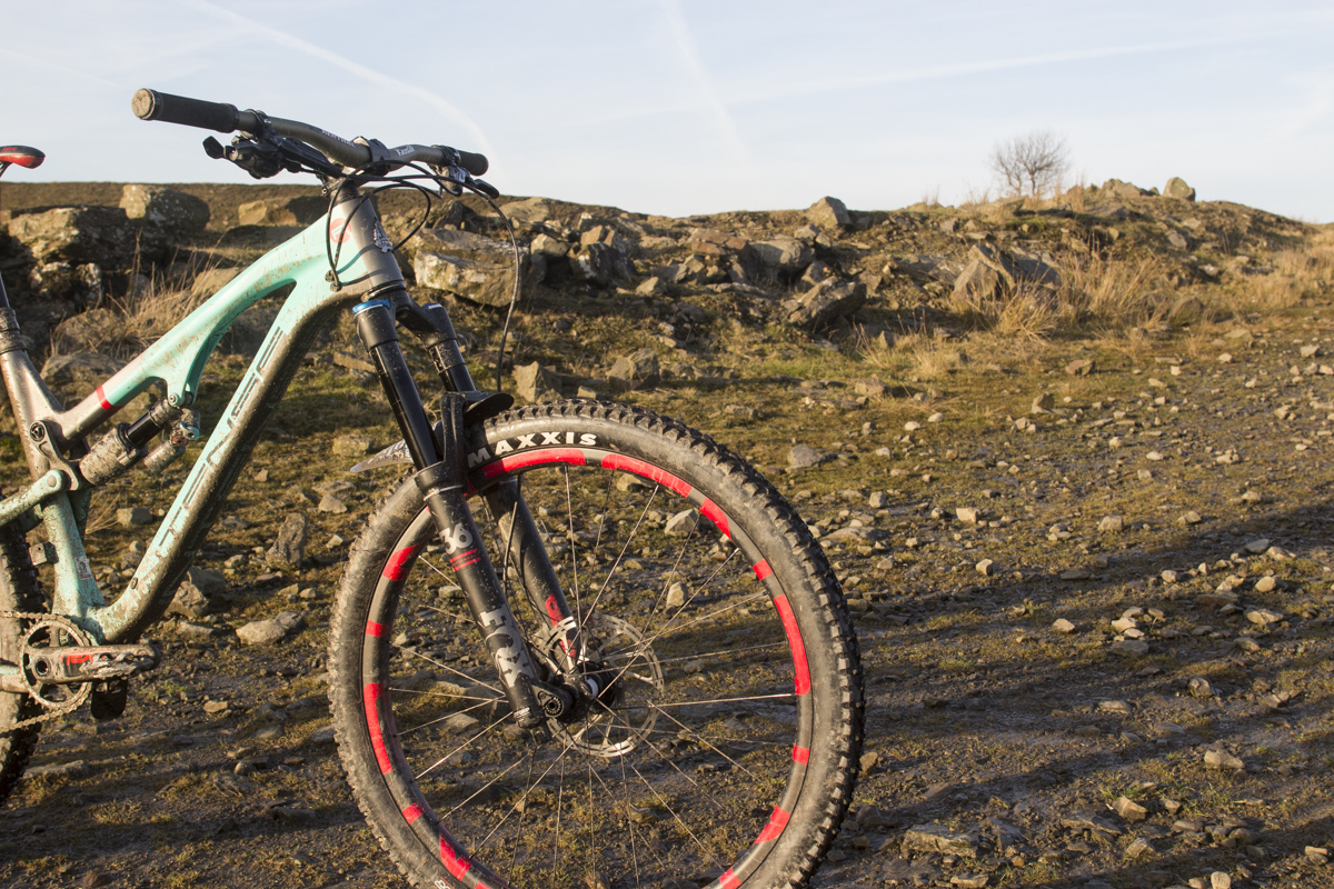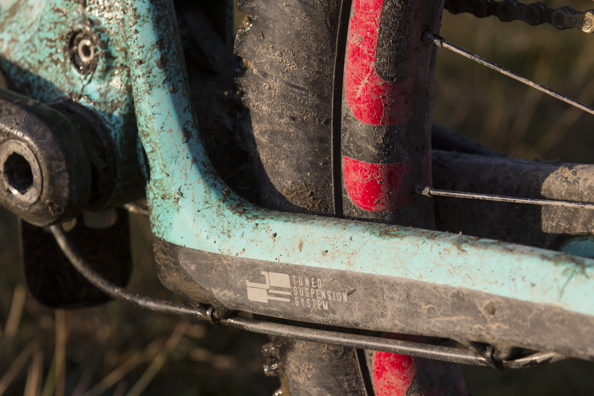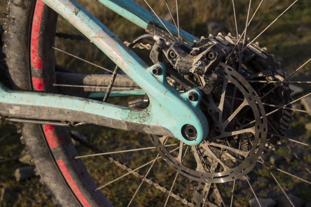 One thing to note is that mud clearance is a bit of an issue with those short chainstays. A weekend of racing up at the Tweed Valley left the rear wheel jammed up on a couple of occasions thanks to the sticky wet clay-based trails. I guess that Intense probably wasn’t thinking about gloopy British conditions during the design phase, but some additional breathing room would be much appreciated, and particularly around that lower link that’s right in the firing line. That said, I did manage to just squeeze in a Maxxis Minion DHF 2.5in tyre in the back end to confirm the max tyre clearance, but I wouldn’t recommend running a big tyre like that unless you’ve never seen mud before.