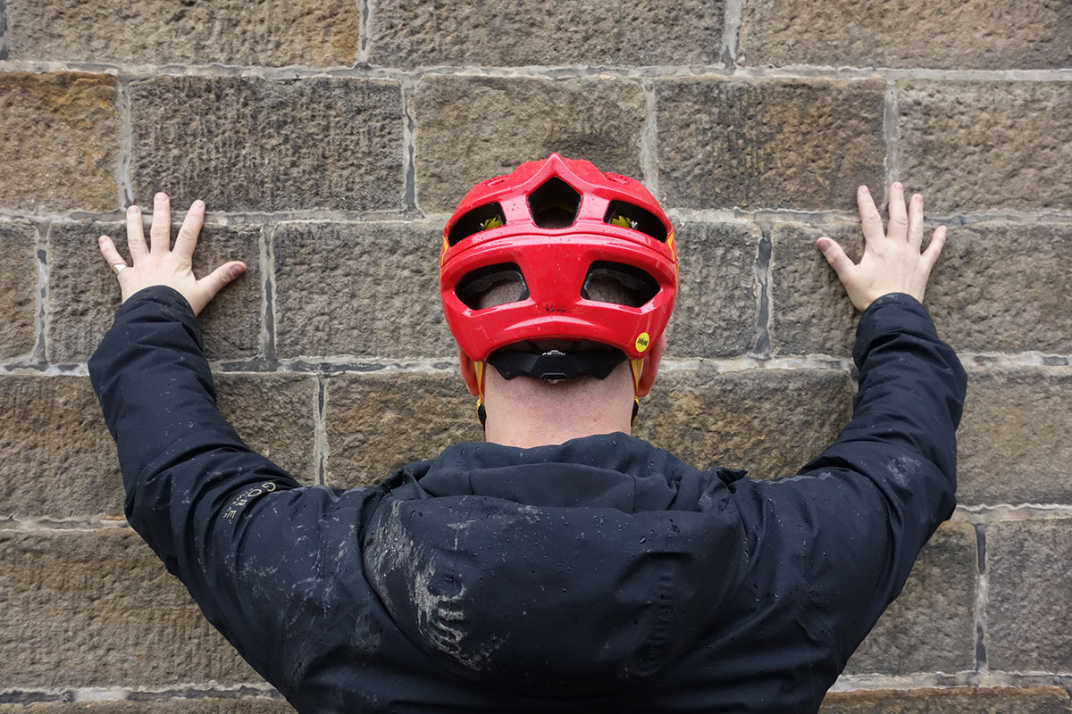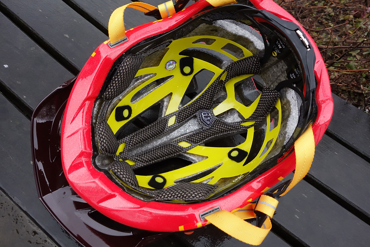 Inside there is a minimal amount of padding, with big channels to keep the air flowing. Even on Chipps’ bald head, it fits securely and comfortably. The MIPS liner moves freely to allow the helmet to rotate in a crash (rather than your brain doing the job) and a small but important feature is the addition of little (black, oblong) Velcro inserts where the MIPS connectors touch the liner. This stops those with longer hair getting it pinched and pulled. (Not a problem for our editor…). You’ll see through the rear vents above, a two coloured grey/black liner. This is made up of two layers of foam. There’s EPP (Expanded Poly Propylene) and EPS (Expanded Poly Styrene). EPS is used in all cycling helmets and offers good protection from hard hits, deforming permanently to absorb the force. EPP is softer and great for slower speed impacts. The A2 is the first helmet to have a dual-foam inmould of the materials.