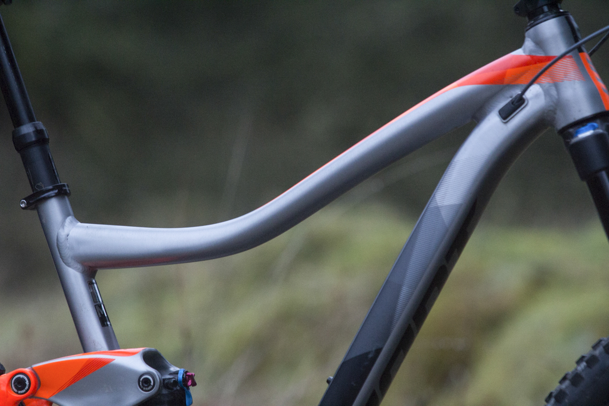 All cables route internally through the front triangle, with the rear brake hose and derailleur cable exiting at the base of the downtube. These then run externally on the rear swingarm, while the dropper post line runs internally all the way through and up into the seat tube.