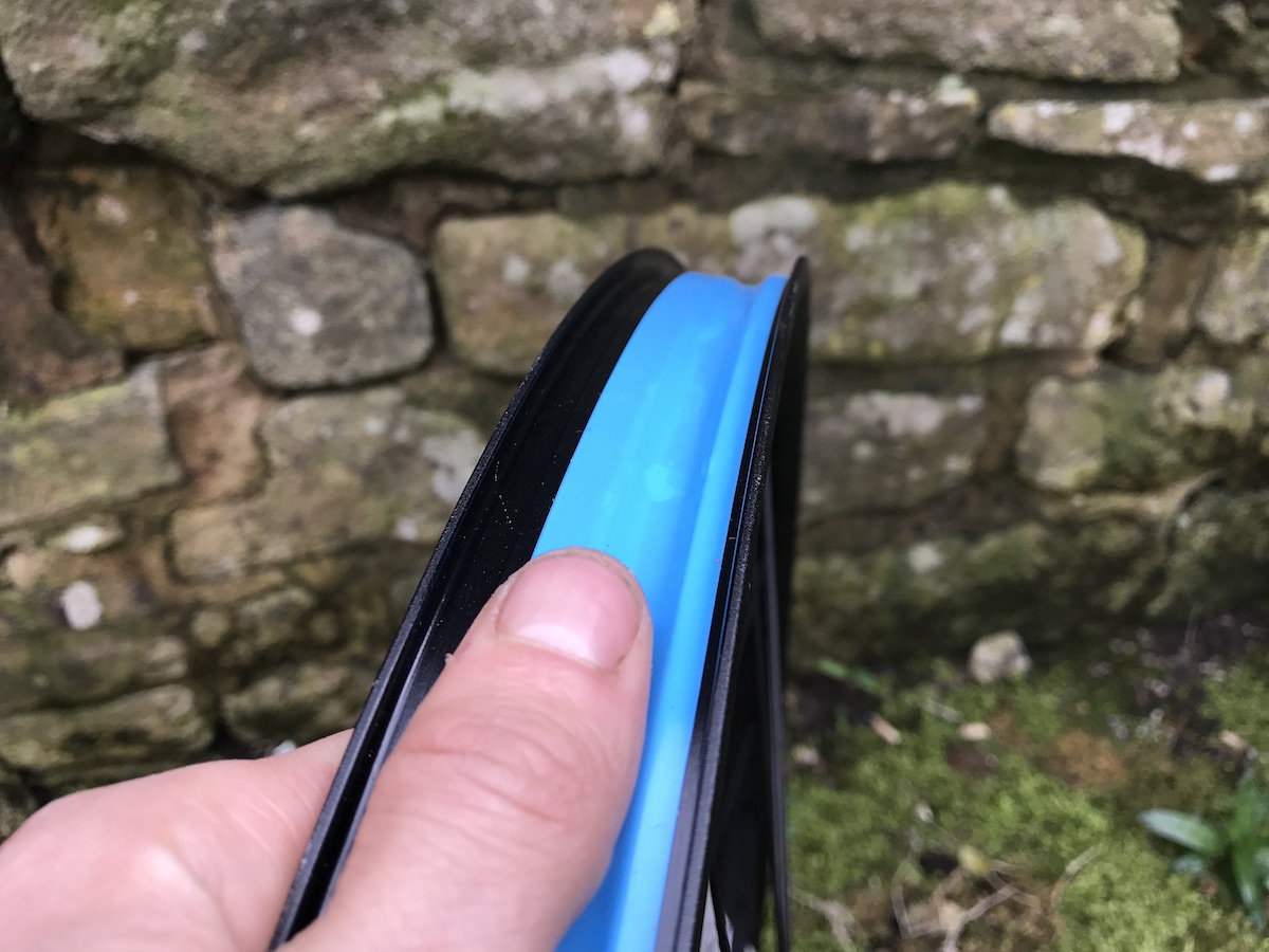 The rims come pre-taped for tubeless inflation. Here you can see the asymmetric rim profile , where the spoke holes sit 5mm off centre. The 738 rims are hookless, and the sidewalls are quite shallow. This should make them tougher than rims with taller sidewalls, which are typically easier to fold over and ding.