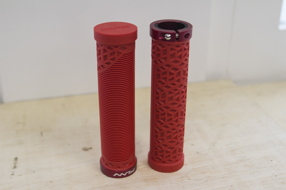 Funn’s new Hilt grips come in black, blue and this lovely bright red colour. They feature a combination rib and waffle pattern (mmmm sounds delicious) and are made of a rather comfortable, soft rubber compound. Tech specs from the Funn website are 30mm diameter and a weight of just 96g.