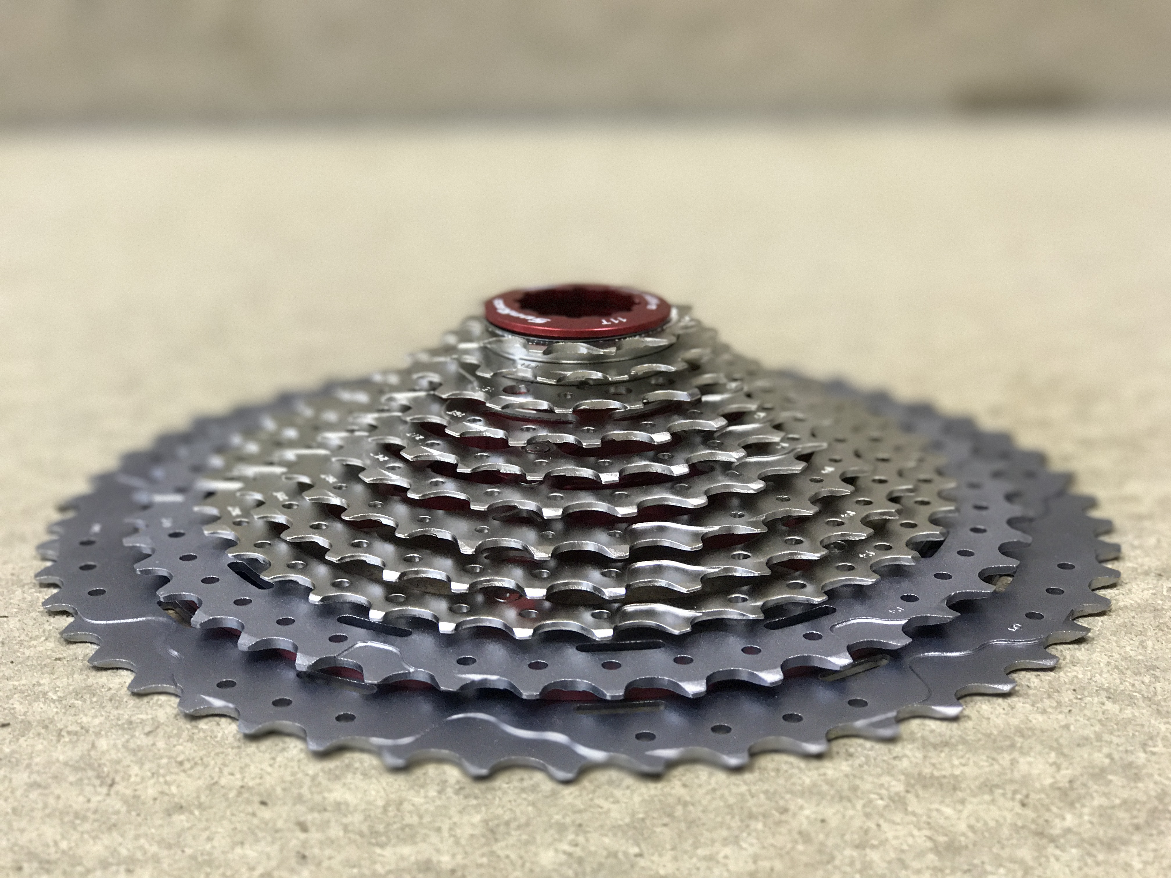 The biggest two sprockets are 7075 alloy, while the rest are steel on two alloy carriers. This certainly lit up our Facebook page when we put it up and we’re really looking forward to seeing how well it works. At a ‘mere’ £99, it’s a third of the price of (12 speed) Eagle and offers four more teeth of bail out gear over Shimano’s widest 11-46 cassette.