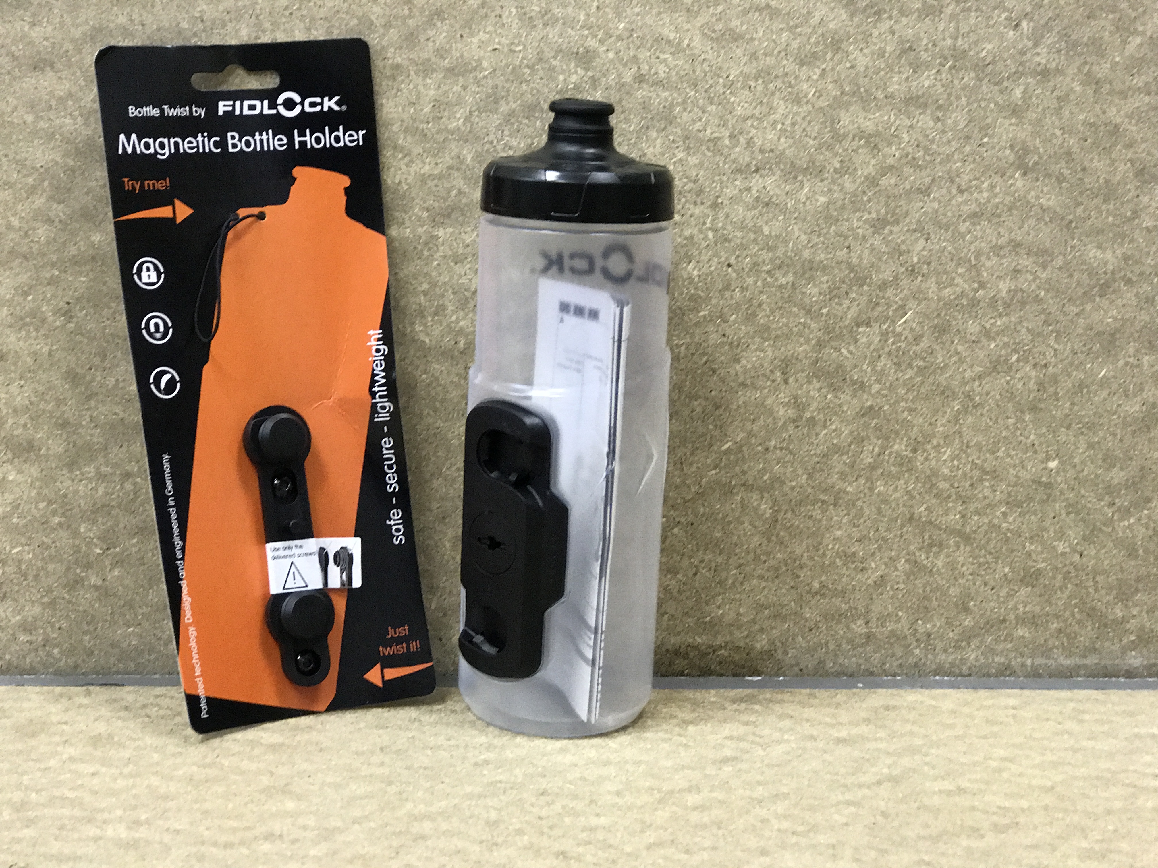 With magnets, mined from the very core of the earth, or perhaps somewhere a little more accessible, this is a bottle with magnetic holding/attachment system. You twist it to get the bottle off, then it pops back into place with a sturdy thunk.