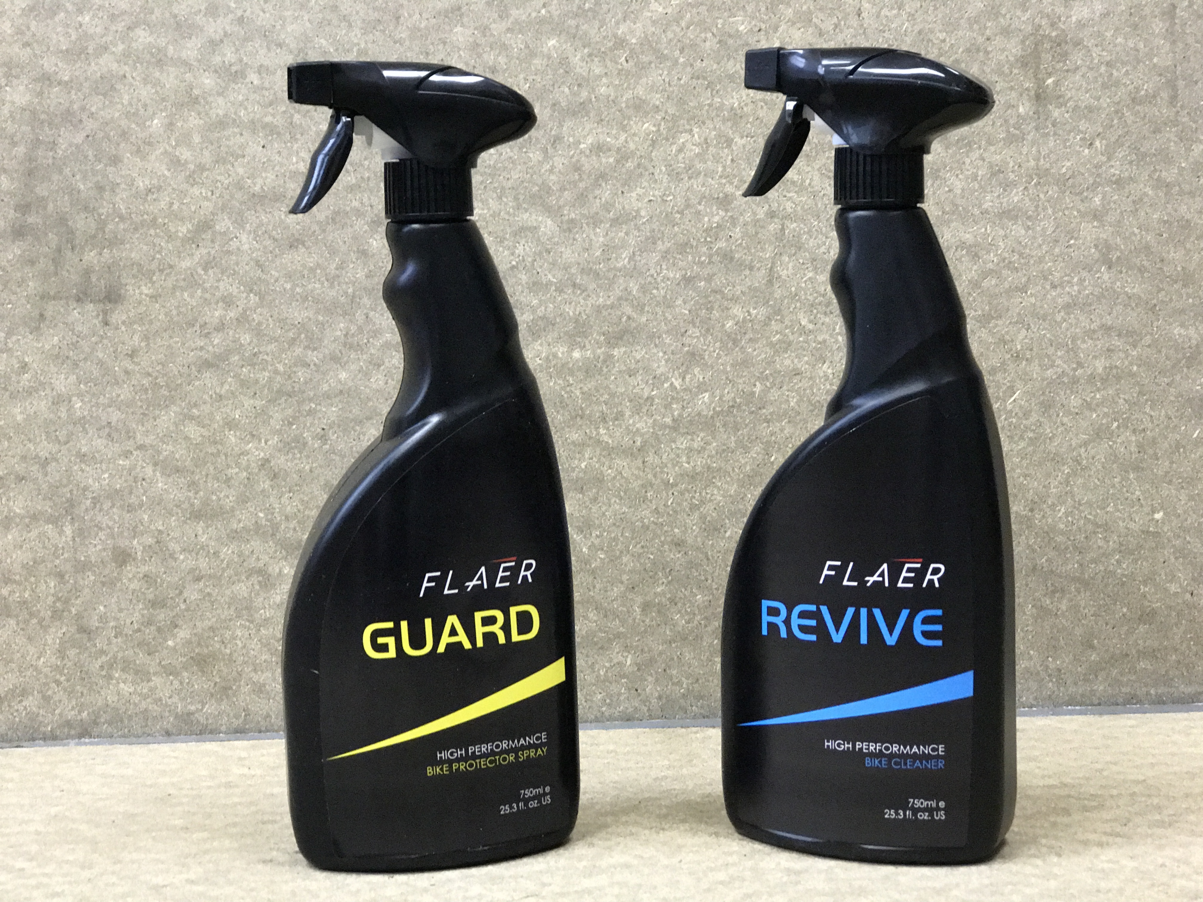 Bike Cleaner and Bike Protector Spray. Ahem. Anyone would think Flaer had been watching our various Facebook Live broadcasts from the trail and noticed that our bikes are just a little muddy. Revive and Guard are safe on all materials including carbon, aluminium, steel, titanium and paintwork, and the Guard will wash off your brakes with water should you get a bit sloppy with your spraying.