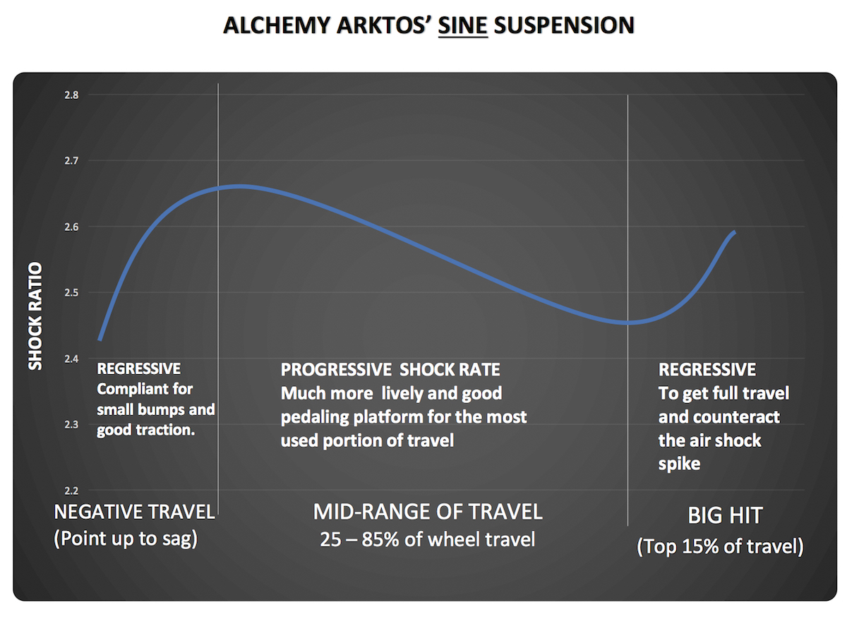 The Sine platform is named as such due to the shape the suspension curve makes on a graph – it looks like a Sine Wave. The idea of this design is to create a regressive initial movement, a progressive mid-stroke and slightly regressive again in the end-stroke. It also looks like a sweet kicker on a trail;