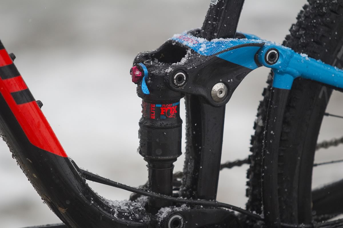 Out back, a new Metric-sized Fox shock bolts on via a trunnion mount, which trades the old DU bush in the upper eyelet for two cartridge bearings. The rocker link itself is a one-piece composite number that Giant claims is 50% lighter and 50% stronger than the alloy version of old.