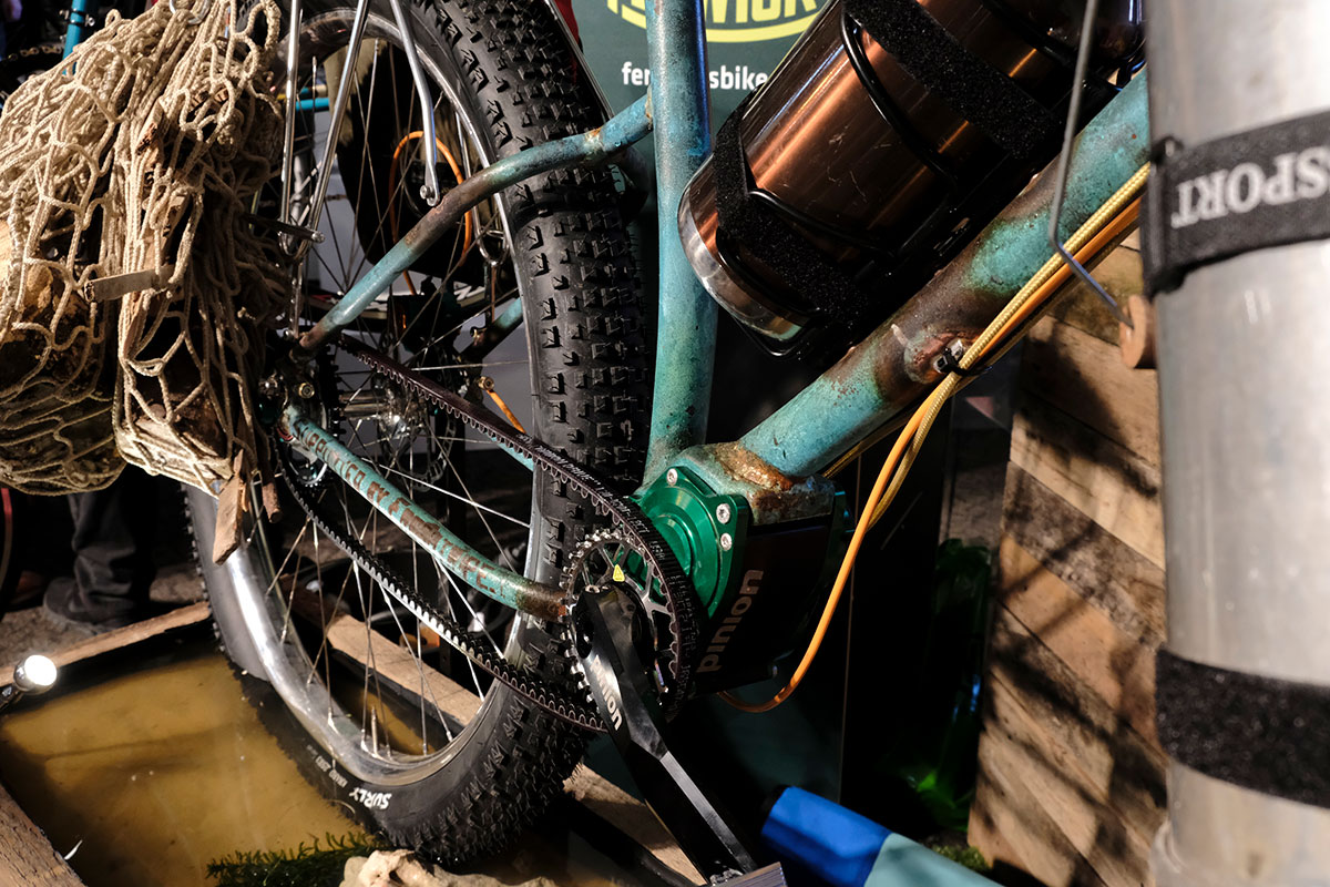 Petor Georgallou is the colourful character behind Dear Susan bikes. Despite the scruffy looks of the bike and the verdigris paint job, there was a lot of thought that had gone into this beachcombing hardtail. Based on the late-80s bikes beloved by Geoff Apps (and featured in the History of British Mountain Biking film) it features a high bottom bracket and a short top tube, in contrast to the low and slack mountain bikes that are currently in-vogue. Petor had accessorised the bike with suitably nautical nick-nacks, including fishing nets, a fabric bucket for shell-collecting and a display stand that featured live fish, happily swimming around the plus sized tyres…