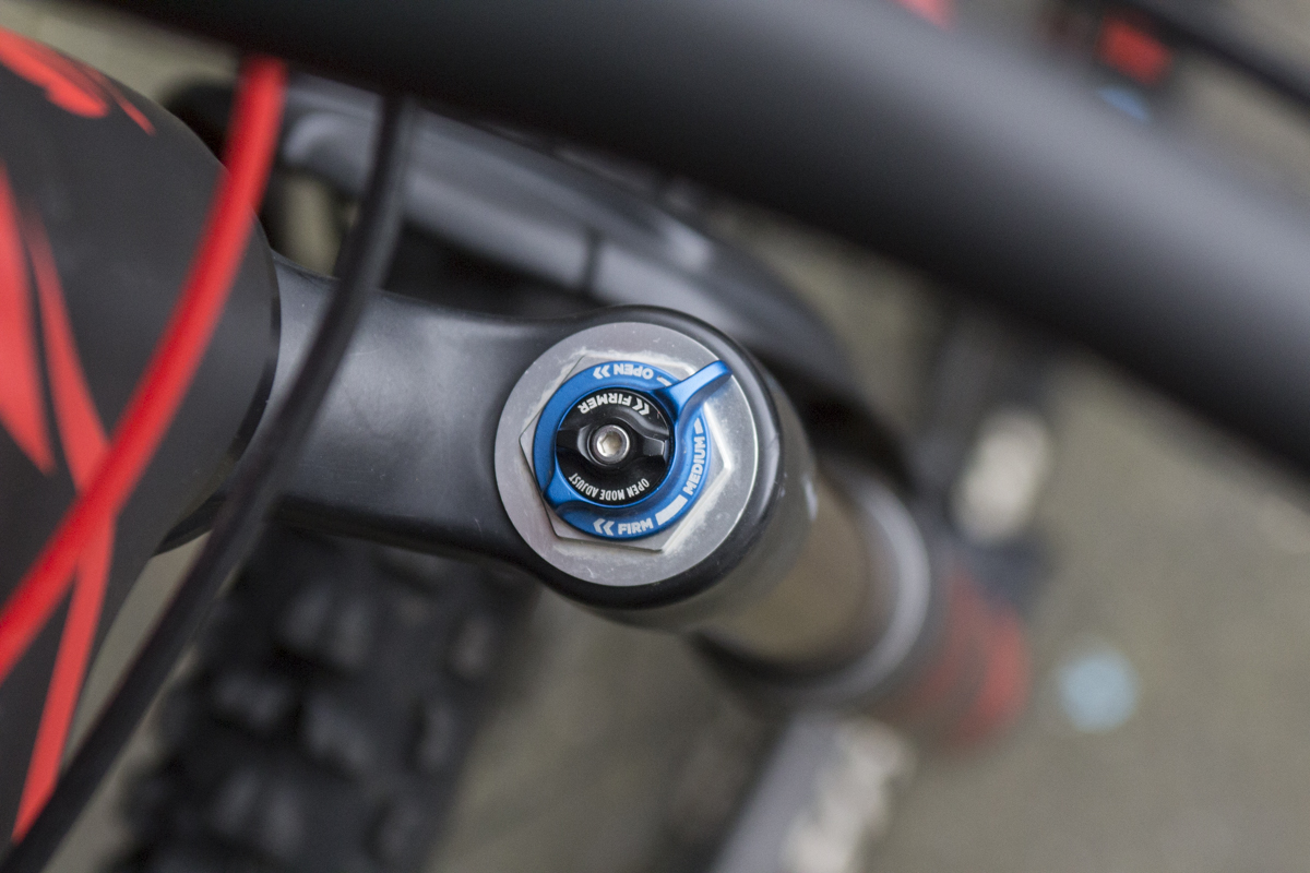 Rather than the independently adjustable low & high-speed compression adjusters, the FIT4 version uses the same damper used in the 34 and 32 fork series. There’s Open-Medium-Firm compression settings, and you can also tweak the low-speed compression damping when in the Open mode via a black dial in the middle of the blue 3-position lever.