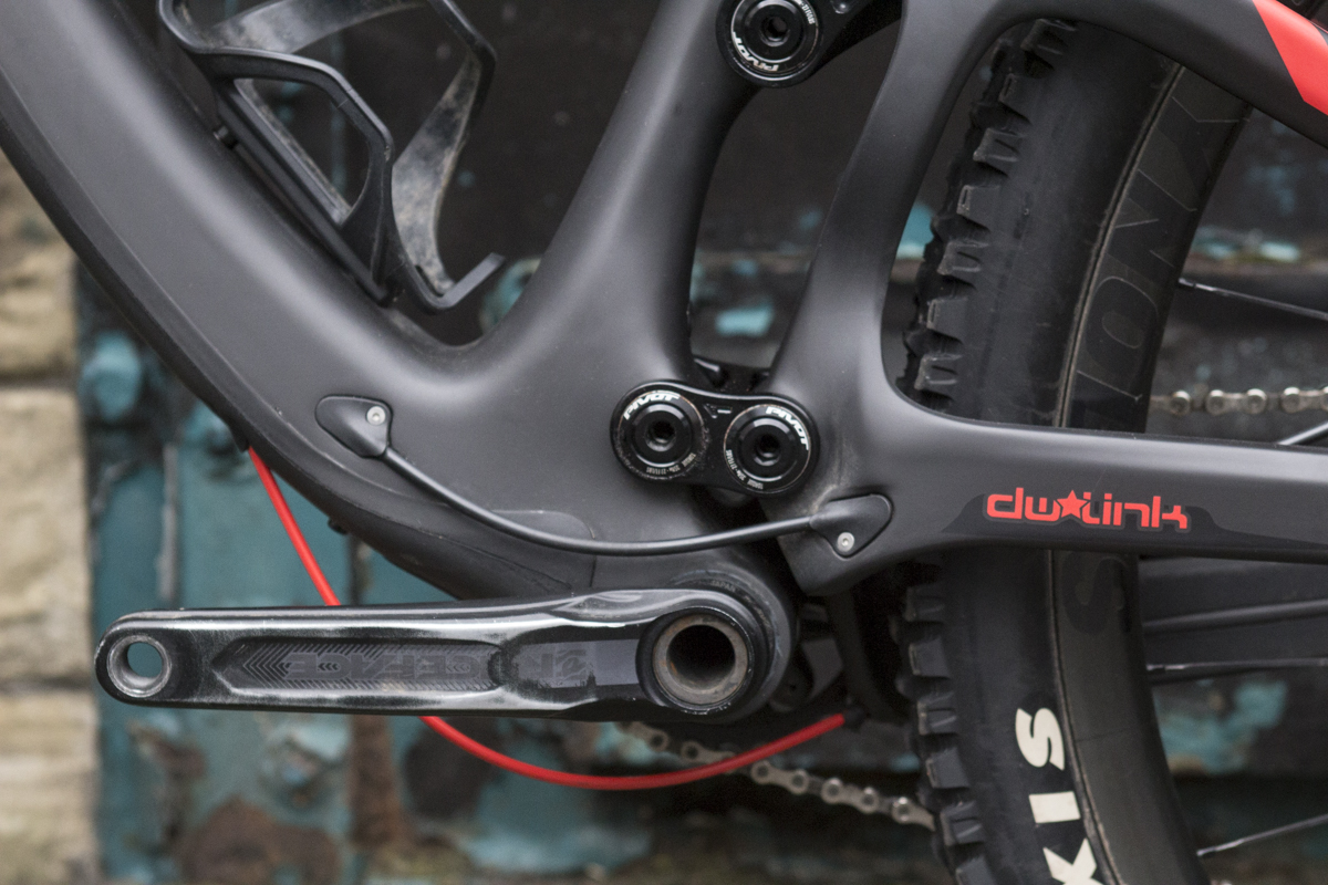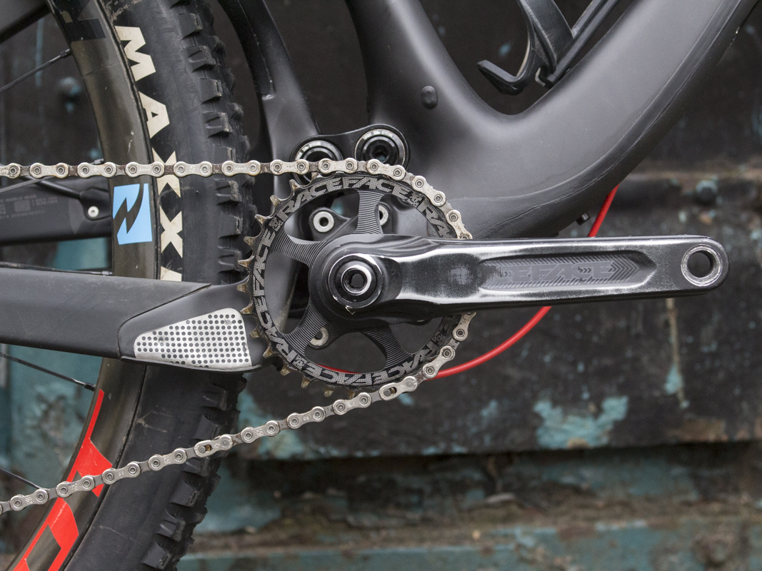 Alloy Race Face Aeffect cranks that use a custom-length 24mm diameter steel spindle. The custom spindle is necessary due to the wider 157x12mm Super Boost Plus thru-axle out back, which (like a regular Boost drivetrain), uses a heavy offset to push the drivetrain further out away from the frame. This is done to maximise tyre clearance, and hence end up with those mega short 428mm chainstays.