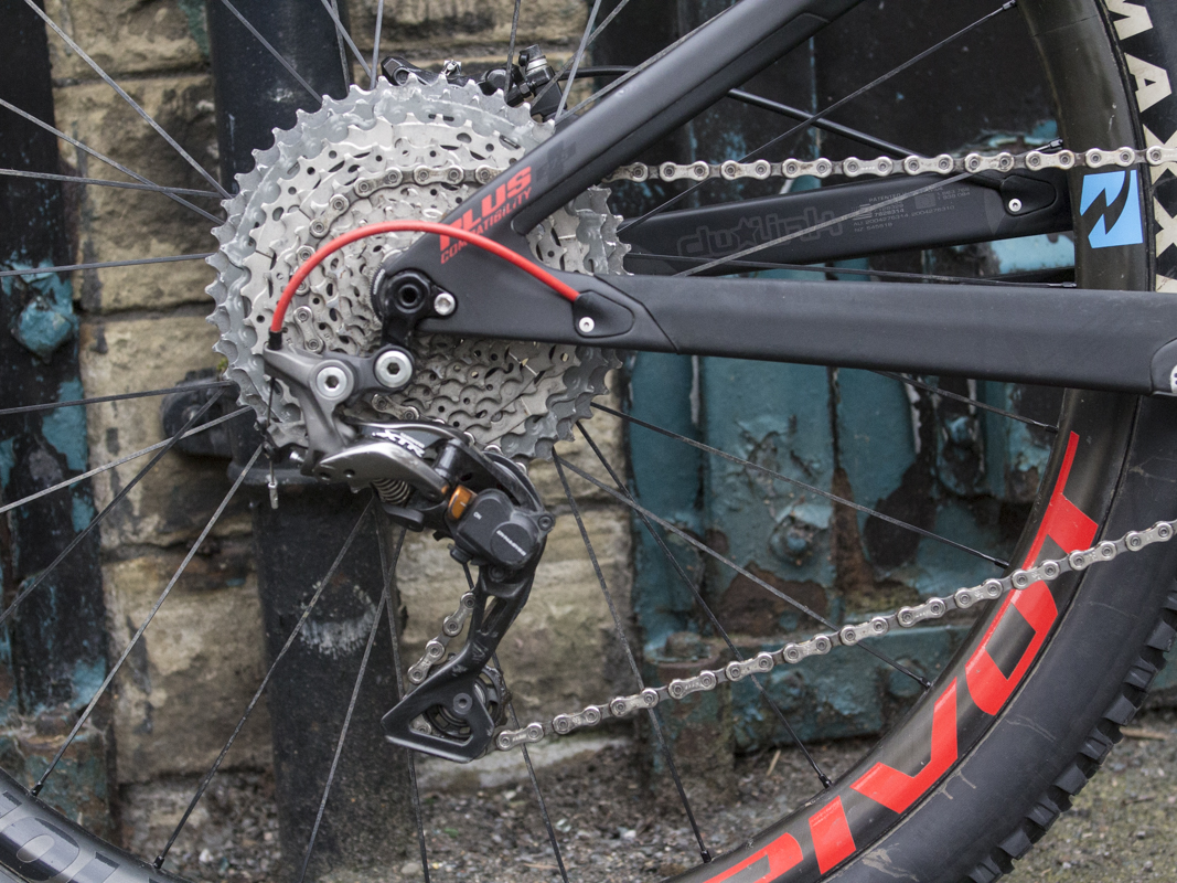 There are numerous 1x and 2x build options available for the Switchblade, though our test bike came supplied with a 1x XTR setup that includes a Shimano XTR Shadow Plus rear mech and an 11-speed Shimano cassette that’s been hopped-up with a One Up 45t cassette expander. However, it’s worth noting that new 1x Switchblades will instead come with a Shimano Deore XT 11-46t cassette.
