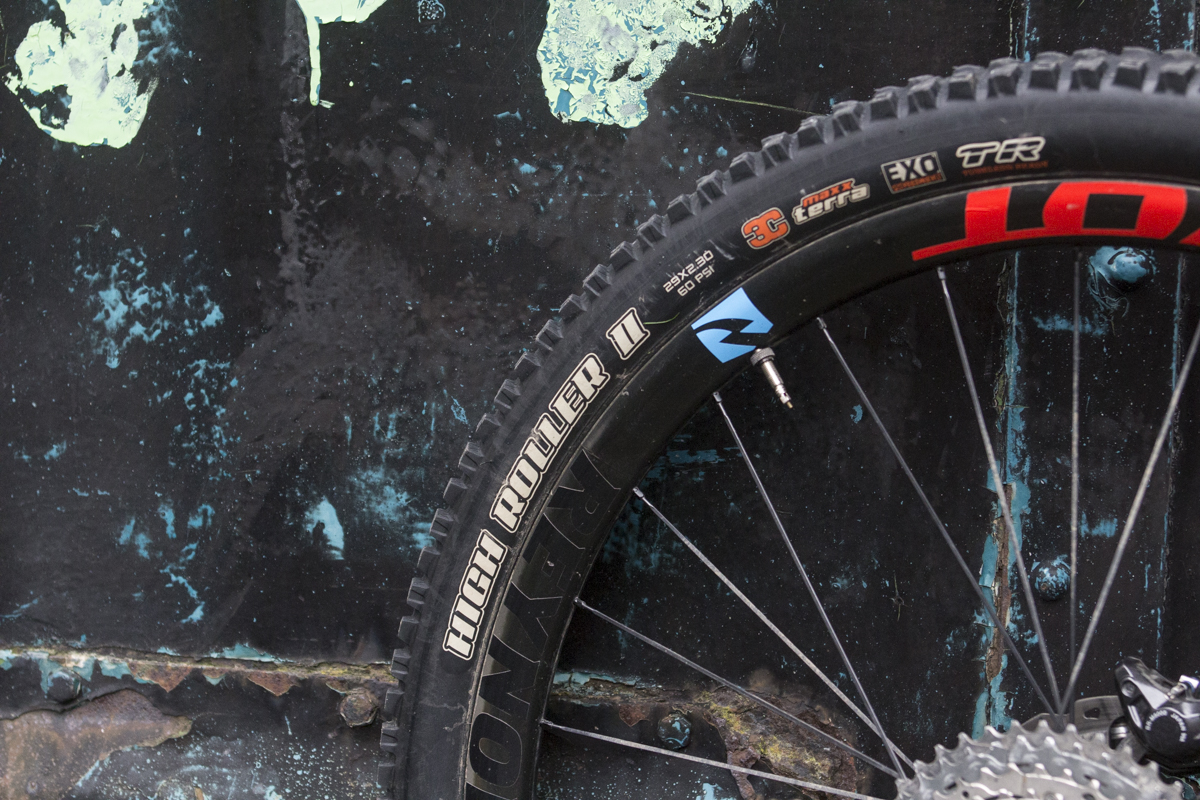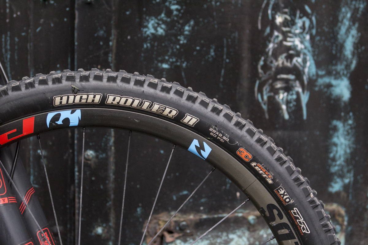 The ever-reliable High Roller II tyre from Maxxis up front, complete with 3C triple-rubber compound and tubeless ready capabilities.