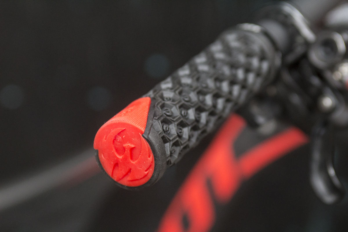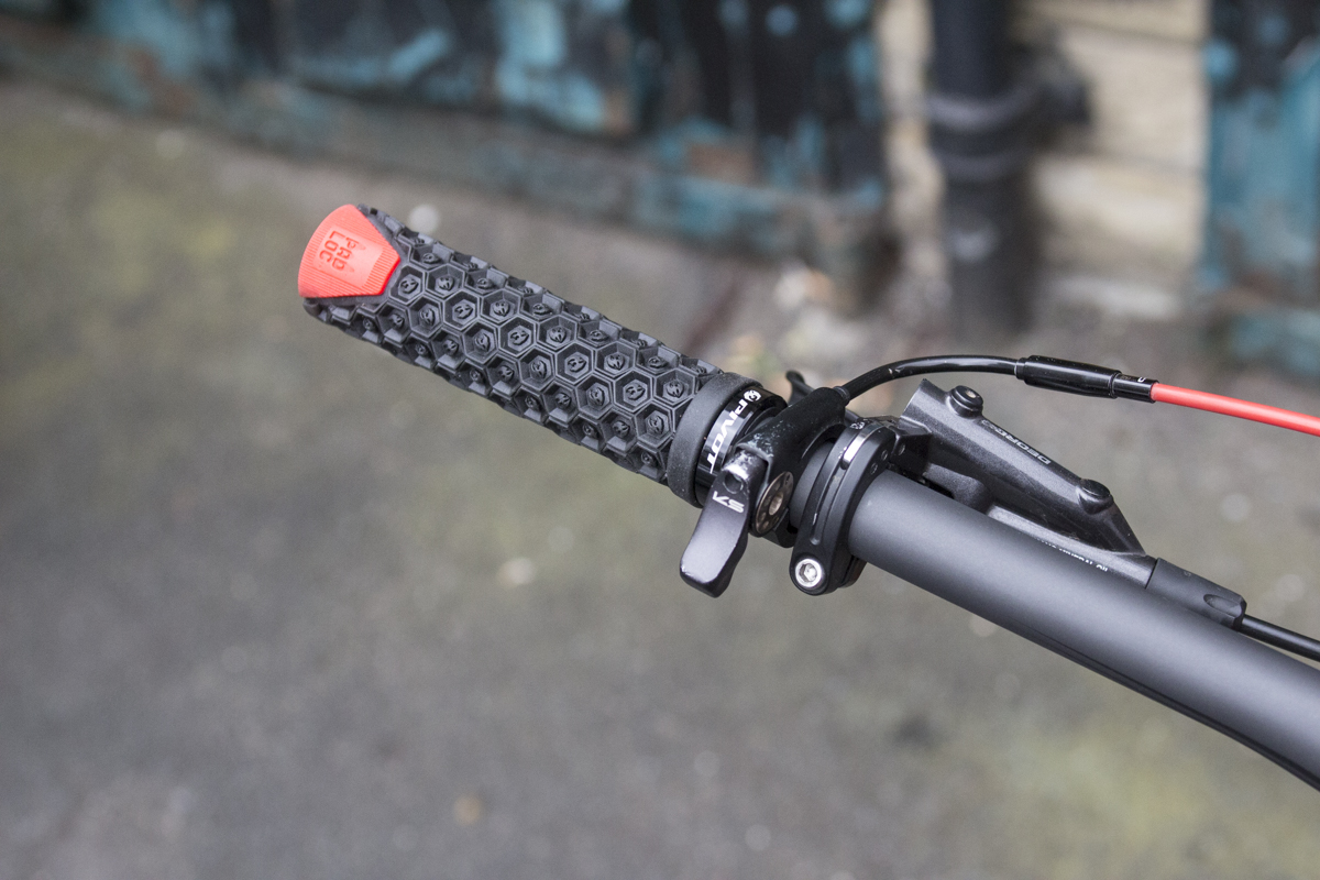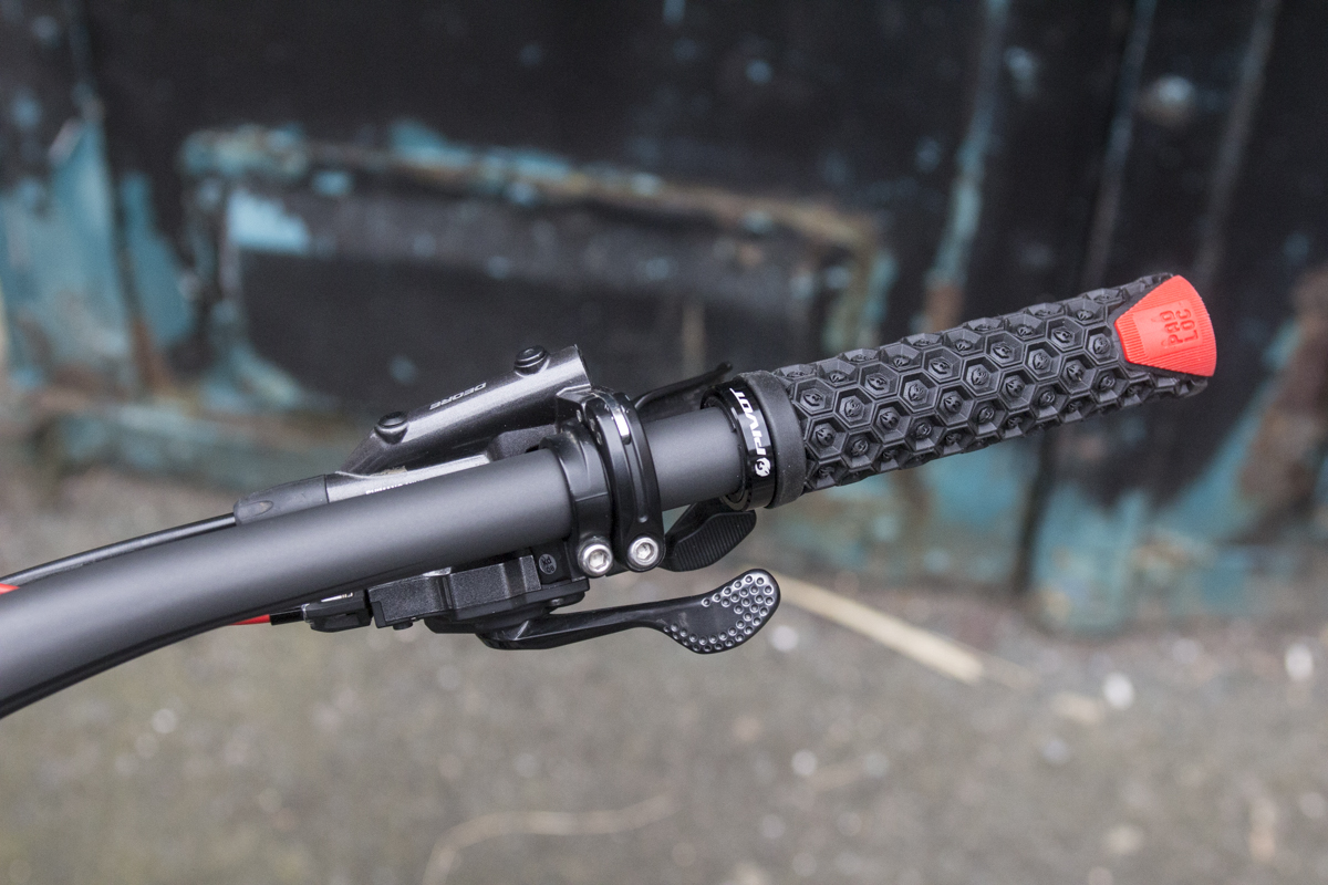 The carbon handlebars are Pivot Cycle’s own, and the bars have been diagonally cut to accommodate the PadLock grips. Got no idea what we’re on about? Check out our review of the WTB Pad Loc grip and handlebar system here.