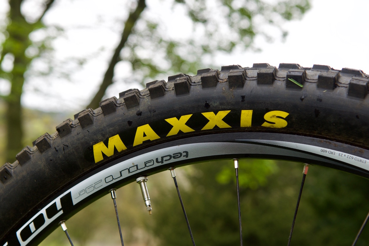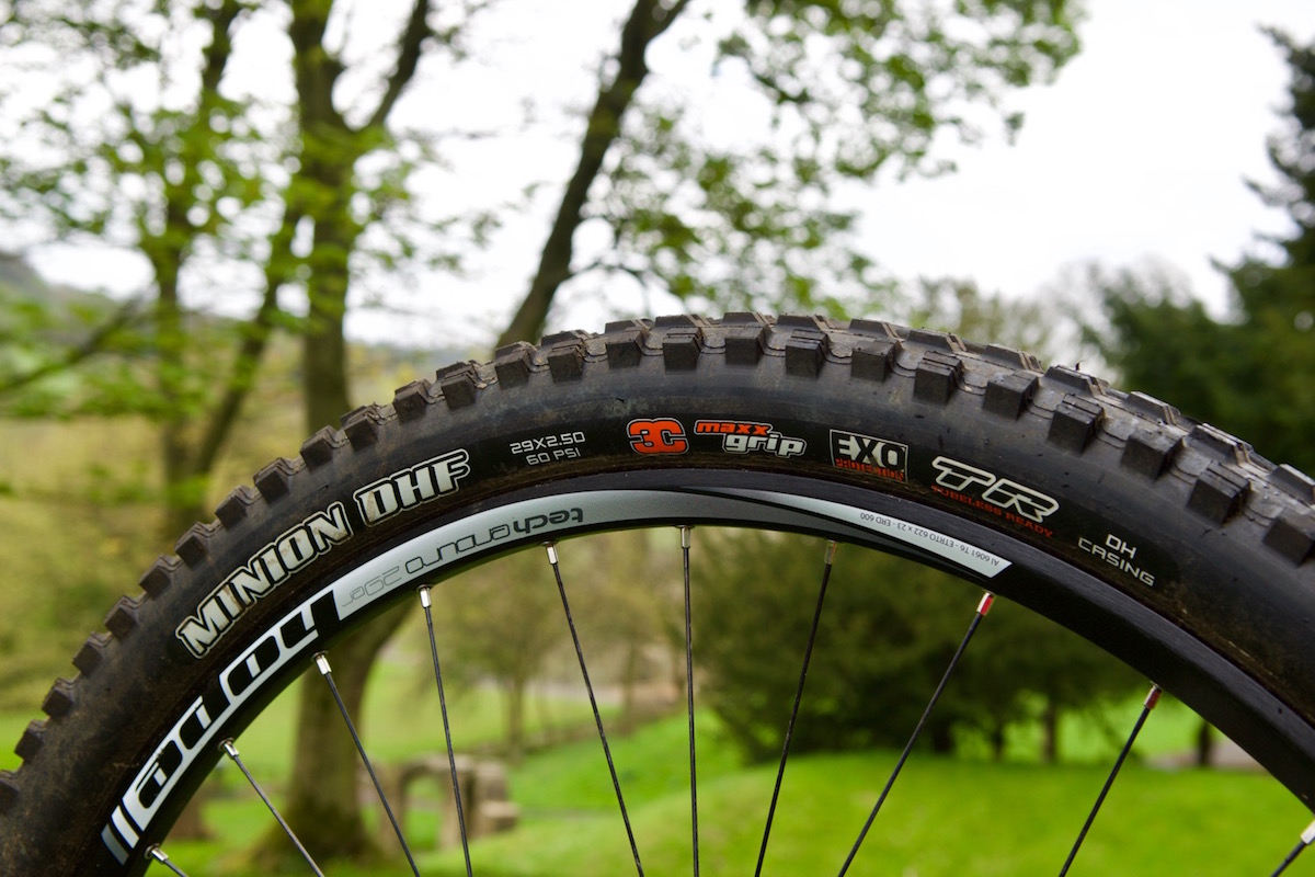 3C? That’s a triple compound construction. There’s a harder base layer for longevity, with a couple of progressively softer layers on top for traction. But it doesn’t end there, oh no. There are 3 different 3C layups – speed, terra and grip. This tyre is the ‘grip’ one, which will therefore sacrifice some longevity for lots of – er – grip. It’s a specifically downhill mixture which also offers slower rebound and better characteristics at speed. EXO refers to a material added to the sidewalls to make them more cut and abrasion resistant; good for rocky Yorkshire, then. And TR simply means that the tyre is tubeless ready.