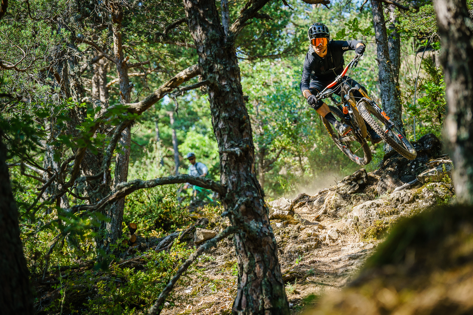 After the main trait of sheer speed, the second attribute I noticed about the Rallon 5 is the balance of the bike especially under heavy braking. The extra speed I was able to carry meant I kept finding myself rushing into the tighter corners and slamming on the anchors later and later before letting the brakes off and smashing through the turn. This balance twinned with the bike’s travel makes this a hugely confidence-inspiring ride. I put this down to the frame’s light weight, the impressive Fox suspension units and frame’s geometry. Orbea has managed to create a bike that has a surperbly optimised frame balancing flex and feedback with strength and rigidity. For most of the first day I was a passenger on an express train. My lasting impression from the first day on the Rallon was just how flattering the bike performed. Getting myself out of countless sticky situations riding these trails blind.