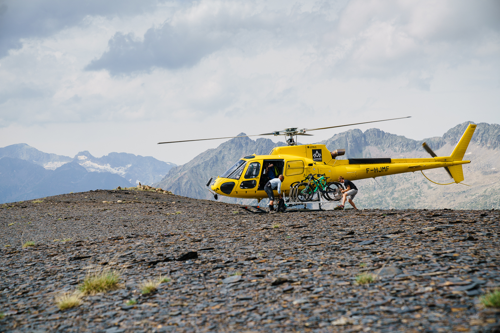 Little did I know, but the day was not over there. After lunch Doug led us to the lift station were we ascended up to the top of SuperBagnéres bike park. Wondering if we were dropping into the bike park trails, we sat waiting completely oblivious to what had been arranged by Orbea. Then the surprising sight of a bright yellow Orbea livered helicopter appeared into view from the blanket of low cloud covering the valley below. The pilot dropped us on a high slate-covered peak well above the tree line. Once the sound of the helicopter disappeared into the distance we dropped into the start of the most epic descent.