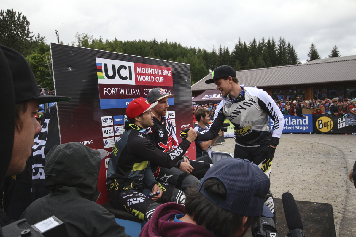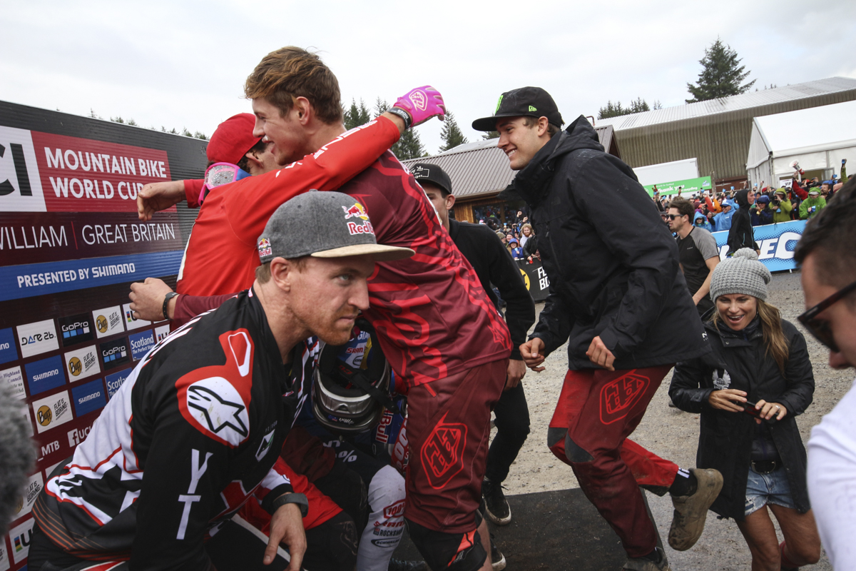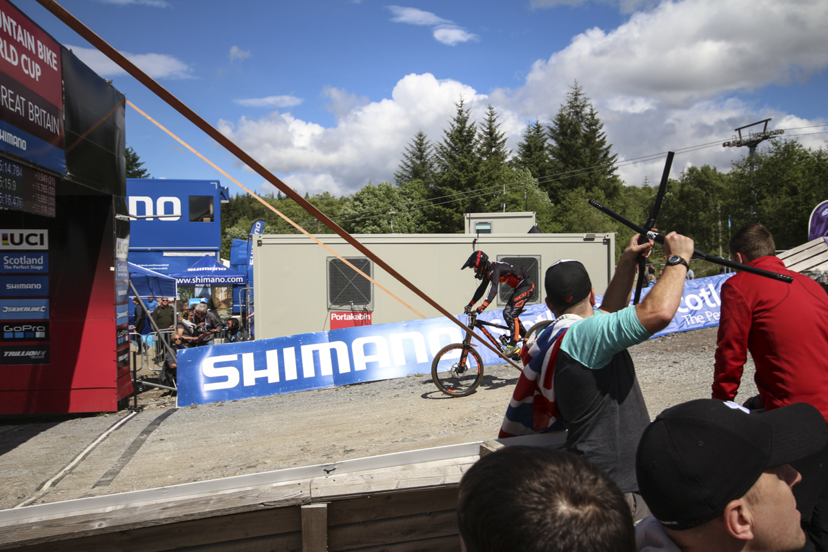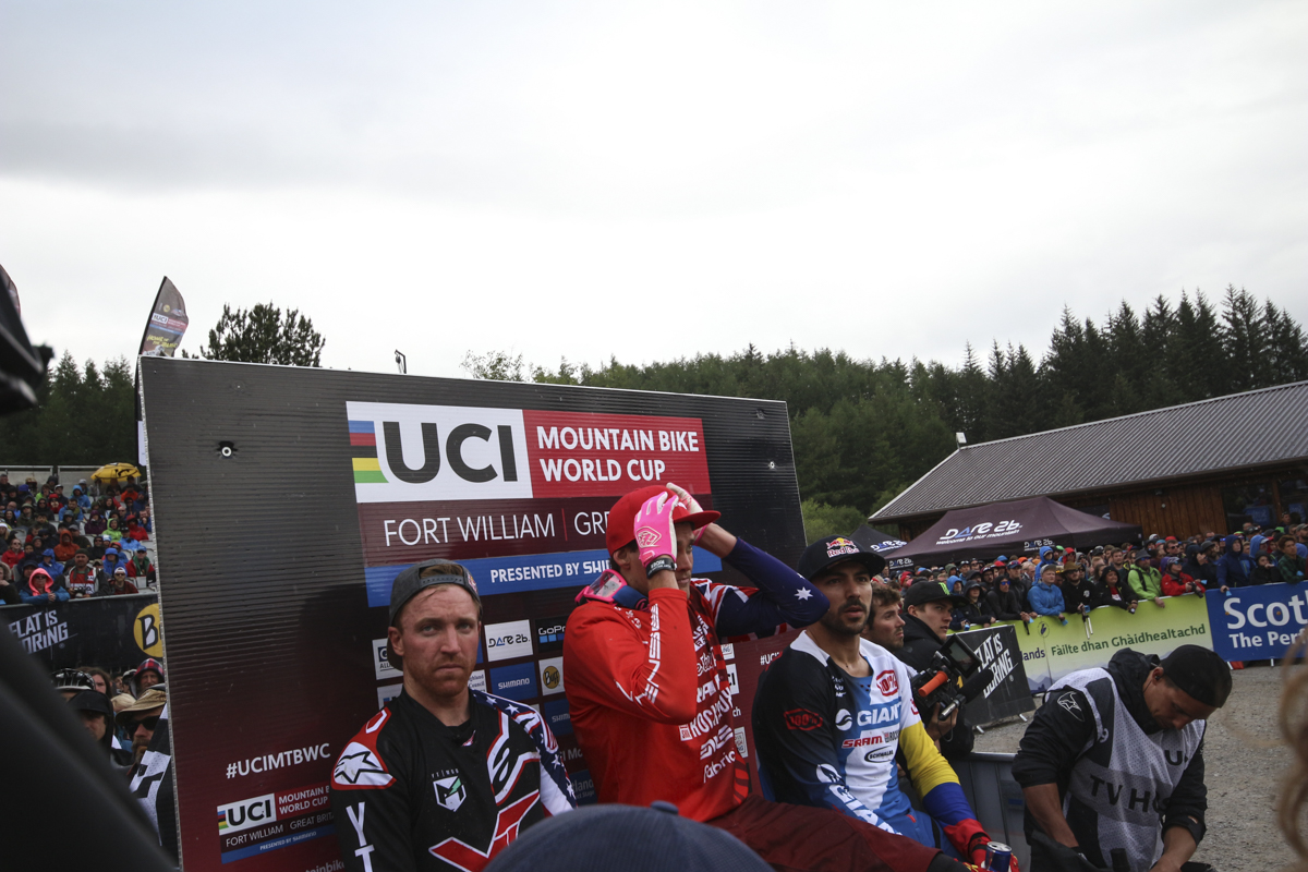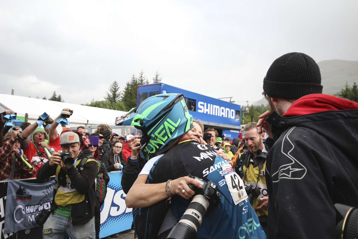 Tracey Hannah keeps her body position low and her eyes on the finish line, on her way to a remarkable win, with a gap of 10 seconds between her and second place. What a ride from Tracey!Eyes on the prize heading to the finish area. Last bit of concentration needed.The spectators make Fort William. I mean, look at that expression!Apparently James requires a body guard these days. Not sure that can be claimed back on expenses though, Jim…Shimano managed to get its message out this weekend, in the shape of many blue and white head dresses.Nothing will beat the crowd up at Fort William. Even the Telletubbies agree.Hitting pieces of metal with other pieces of metal to make as much noise as humanly possible. That’s the way of Fort Bill. And we love it.Bernard Kerr – the only man to get to the bottom of the hill without a rear mech or chain. After it jammed in the top section, Kerr managed to get the chain free, but was unable to pedal for two thirds of the race. Finishing in 13th was an unbelievable achievement.Cumbrian born and bred Adam Brayton was content with staying on his bike for his race run, and finished with a very respectable 17th place.The weather wasn’t full Scotland, for the second year in a row. What will next year hold, we wonder?Mick Hannah may not have finished on the top step, but a brief spell there after a ridiculous suicide no-hander over the jumps on the motorway section was probably enough to keep him happy.The muddy telltale of a crash in the woods.Brendan Fairclough had a disapointing run at Fort Bill this year, and he was the first to say so, when he spoke with our top correspondent Ross, post race.Bruni through the crowds, looking disappointed with his race day performance.Rupert Chapman had a lesser-spotted front puncture on his race day run, which led to him slipping out of point-grabbing places.A fist pump for Mulally who nailed his run, but could only finish in 7th overall.Winner of the last round in Lourdes, Alexandre Fayolle could only manage a 36th place finish at Fort William, after hitting the deck earlier in his run.Laurie Greenland may have had a big old crash in qualifying, but with him setting the fastest time in practice, he was always racing on the Sunday. He threw down a massive run and finished in 9th place. What a guy.The crowd know what they want to see.Steve Peat passes on his expertise to the up and coming generation in the Santacruz Syndicate team – Luca Shaw.Connor Fearon produced a blinding run down Fort William this year, which rewarded him nicely with an 8th place overall finish.Top commentary on race day as always, provided by Dan Jarvis.The support for the UK riders will always be strong at Fort William. Unfortunately, today wasn’t the day for the home nation riders.Danny Hart had a crash in the woods which left him way down the pecking order. A truly frustrating day for Danny, he headed straight back to the truck.A quick check back to the time board, before Aaron Gwin takes his seat on the top step.Troy Brosnan shakes hands with Remi Thirion on the as he gets knocked down a step by the Frenchman.A truly sportsman like scene from the hot seat. Jack Moir shakes hands with Aaron Gwin, who he has just knocked off top spot.Nerves were kicking in for Moir, who had to watch two more riders hit the track before he knew his fate. Aarron Gwin watches the big screen to see where his finish will be.Now that’s a man who’s been waiting for this day, for far too long.Jack Moir watches the big screen as the last man on course, Greg Minnaar heads down the track.A mix of emotions indeed. Aaron Gwin was disapointed with his 3rd place finish after making a mistake in the woods, whereas the Intense Factory Racing team cannot get to Jack Moir quick enough to celebrate his 2nd place.Jeff Steber celebrates with the rest of the Intense Factory Racing team, with Jack Moir bagging himself a 2nd place finish at Fort William.A true party atmosphere at the Fort William finish line.It’s hugs and smiles all round for the Syndicate team.A clearly emotional day for all involved, no more so than the winner himself – Greg Minnaar.He may not be racing anymore, but Steve Peat is still more than involved with the Santacruz Syndicate team.A proud moment for Steve, as he watches his good friend smash yet another World Cup win.Syndicate Team Mum, Kathy Sessler is clearly emotional after another victory for her Syndicate star.Ex-teammate Steve Peat cannot control his excitement as Greg Minnaar is announced as the 2017 Fort William winner.Elation for Mr Fort William. Greg Minnaar takes the win for back to back top step results at Fort Bill.A proper downhill cassette, that. #NotEagleJack Moir – one happy man!Jack Moir celebrates with friends and family after an unbelievable run down the Fort William 2017 track. Big things to come from this lad, that’s for sure.Kathy Sessler was over the moon with yet another win for her team up at Fort William.Jack Moir’s 2nd place bike. The Aussie got his first ever podium this weekend up at Fort William.Luca Shaw looks at his team mate after Minnaar picked up the win here in Fort William this weekend. The Syndicate boys are giving competitors a reason to be worried with results like this.The winning bike. Greg Minnaar’s 29in wheel equipped Santacruz V10.A deserved winner! Greg Minnaar makes in 7 wins at Fort William from 15, and a 20th overall World Cup win. What a racer this man is.