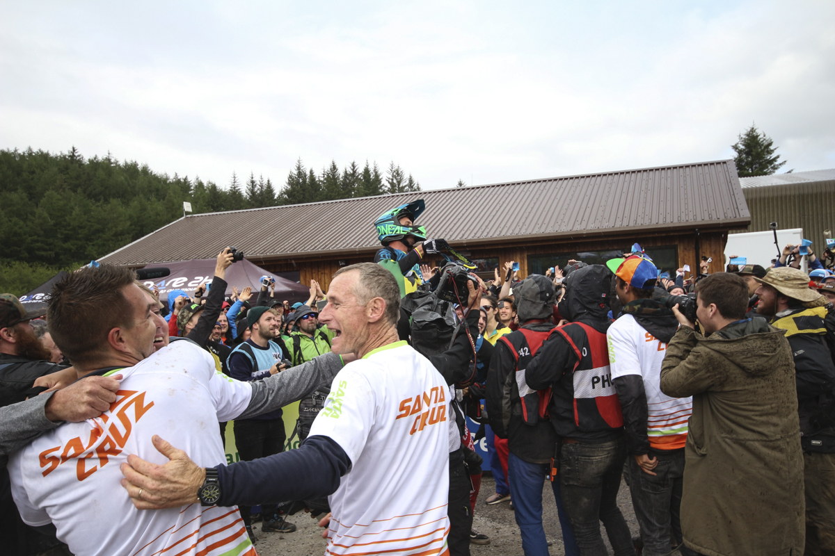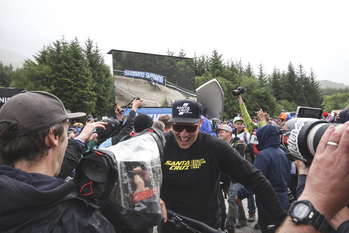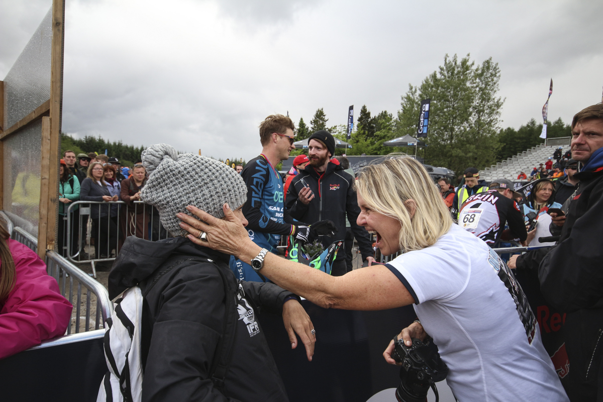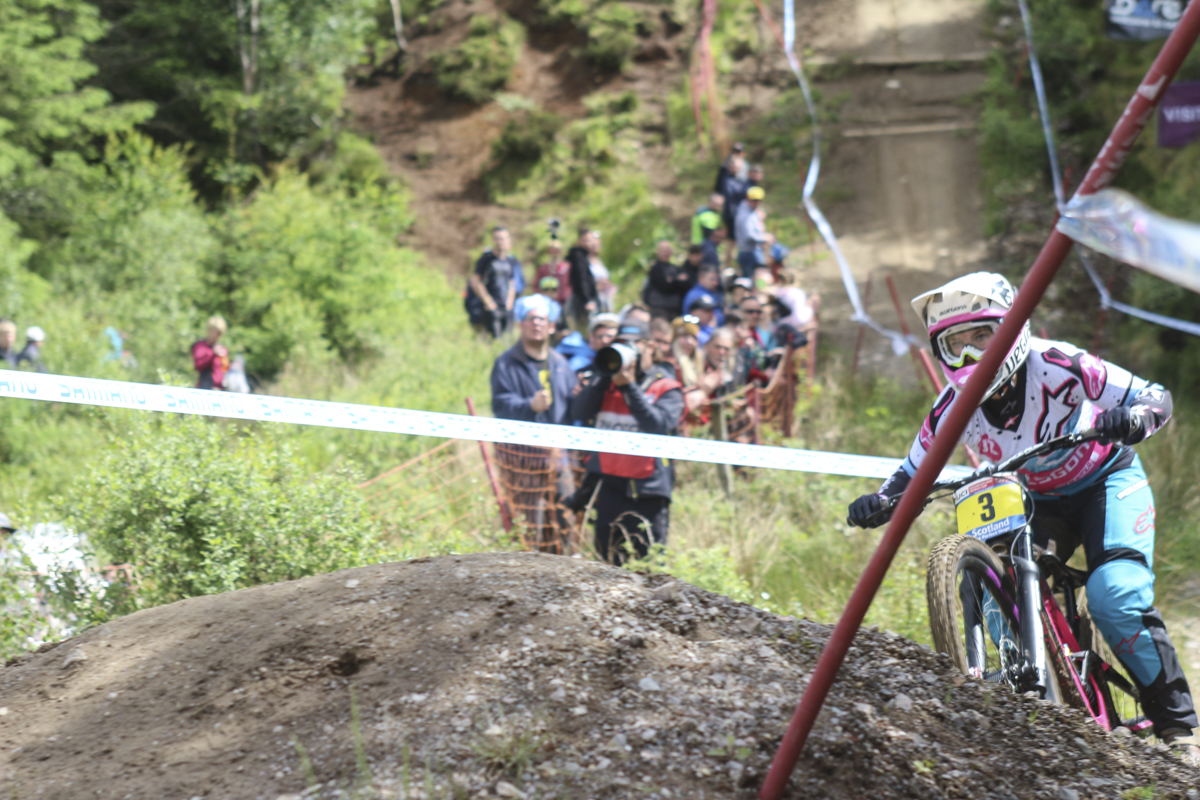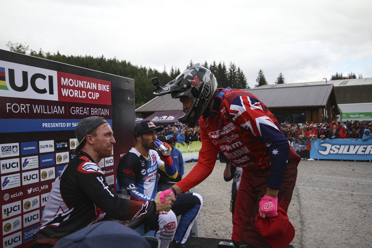 Tracey Hannah keeps her body position low and her eyes on the finish line, on her way to a remarkable win, with a gap of 10 seconds between her and second place. What a ride from Tracey!Eyes on the prize heading to the finish area. Last bit of concentration needed.The spectators make Fort William. I mean, look at that expression!Apparently James requires a body guard these days. Not sure that can be claimed back on expenses though, Jim…Shimano managed to get its message out this weekend, in the shape of many blue and white head dresses.Nothing will beat the crowd up at Fort William. Even the Telletubbies agree.Hitting pieces of metal with other pieces of metal to make as much noise as humanly possible. That’s the way of Fort Bill. And we love it.Bernard Kerr – the only man to get to the bottom of the hill without a rear mech or chain. After it jammed in the top section, Kerr managed to get the chain free, but was unable to pedal for two thirds of the race. Finishing in 13th was an unbelievable achievement.Cumbrian born and bred Adam Brayton was content with staying on his bike for his race run, and finished with a very respectable 17th place.The weather wasn’t full Scotland, for the second year in a row. What will next year hold, we wonder?Mick Hannah may not have finished on the top step, but a brief spell there after a ridiculous suicide no-hander over the jumps on the motorway section was probably enough to keep him happy.The muddy telltale of a crash in the woods.Brendan Fairclough had a disapointing run at Fort Bill this year, and he was the first to say so, when he spoke with our top correspondent Ross, post race.Bruni through the crowds, looking disappointed with his race day performance.Rupert Chapman had a lesser-spotted front puncture on his race day run, which led to him slipping out of point-grabbing places.A fist pump for Mulally who nailed his run, but could only finish in 7th overall.Winner of the last round in Lourdes, Alexandre Fayolle could only manage a 36th place finish at Fort William, after hitting the deck earlier in his run.Laurie Greenland may have had a big old crash in qualifying, but with him setting the fastest time in practice, he was always racing on the Sunday. He threw down a massive run and finished in 9th place. What a guy.The crowd know what they want to see.Steve Peat passes on his expertise to the up and coming generation in the Santacruz Syndicate team – Luca Shaw.Connor Fearon produced a blinding run down Fort William this year, which rewarded him nicely with an 8th place overall finish.Top commentary on race day as always, provided by Dan Jarvis.The support for the UK riders will always be strong at Fort William. Unfortunately, today wasn’t the day for the home nation riders.Danny Hart had a crash in the woods which left him way down the pecking order. A truly frustrating day for Danny, he headed straight back to the truck.A quick check back to the time board, before Aaron Gwin takes his seat on the top step.Troy Brosnan shakes hands with Remi Thirion on the as he gets knocked down a step by the Frenchman.A truly sportsman like scene from the hot seat. Jack Moir shakes hands with Aaron Gwin, who he has just knocked off top spot.Nerves were kicking in for Moir, who had to watch two more riders hit the track before he knew his fate. Aarron Gwin watches the big screen to see where his finish will be.Now that’s a man who’s been waiting for this day, for far too long.Jack Moir watches the big screen as the last man on course, Greg Minnaar heads down the track.A mix of emotions indeed. Aaron Gwin was disapointed with his 3rd place finish after making a mistake in the woods, whereas the Intense Factory Racing team cannot get to Jack Moir quick enough to celebrate his 2nd place.Jeff Steber celebrates with the rest of the Intense Factory Racing team, with Jack Moir bagging himself a 2nd place finish at Fort William.A true party atmosphere at the Fort William finish line.It’s hugs and smiles all round for the Syndicate team.A clearly emotional day for all involved, no more so than the winner himself – Greg Minnaar.He may not be racing anymore, but Steve Peat is still more than involved with the Santacruz Syndicate team.A proud moment for Steve, as he watches his good friend smash yet another World Cup win.Syndicate Team Mum, Kathy Sessler is clearly emotional after another victory for her Syndicate star.Ex-teammate Steve Peat cannot control his excitement as Greg Minnaar is announced as the 2017 Fort William winner.Elation for Mr Fort William. Greg Minnaar takes the win for back to back top step results at Fort Bill.A proper downhill cassette, that. #NotEagleJack Moir – one happy man!Jack Moir celebrates with friends and family after an unbelievable run down the Fort William 2017 track. Big things to come from this lad, that’s for sure.Kathy Sessler was over the moon with yet another win for her team up at Fort William.Jack Moir’s 2nd place bike. The Aussie got his first ever podium this weekend up at Fort William.Luca Shaw looks at his team mate after Minnaar picked up the win here in Fort William this weekend. The Syndicate boys are giving competitors a reason to be worried with results like this.The winning bike. Greg Minnaar’s 29in wheel equipped Santacruz V10.A deserved winner! Greg Minnaar makes in 7 wins at Fort William from 15, and a 20th overall World Cup win. What a racer this man is.