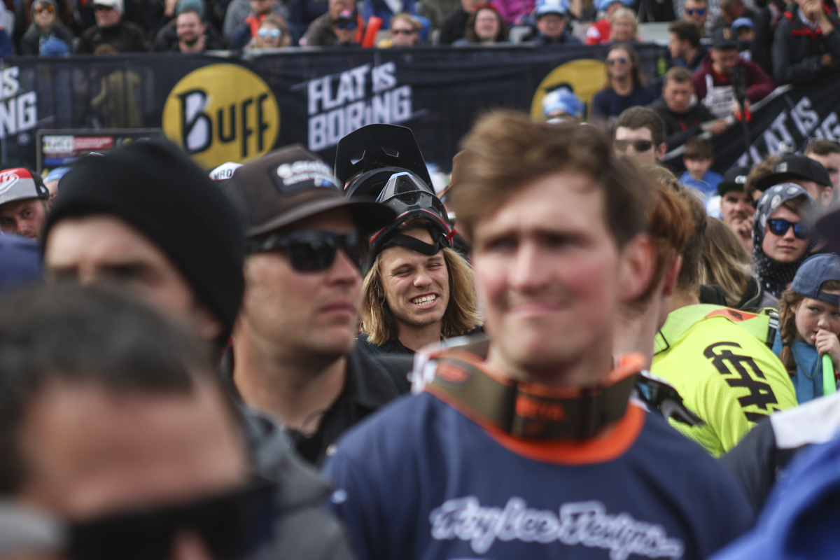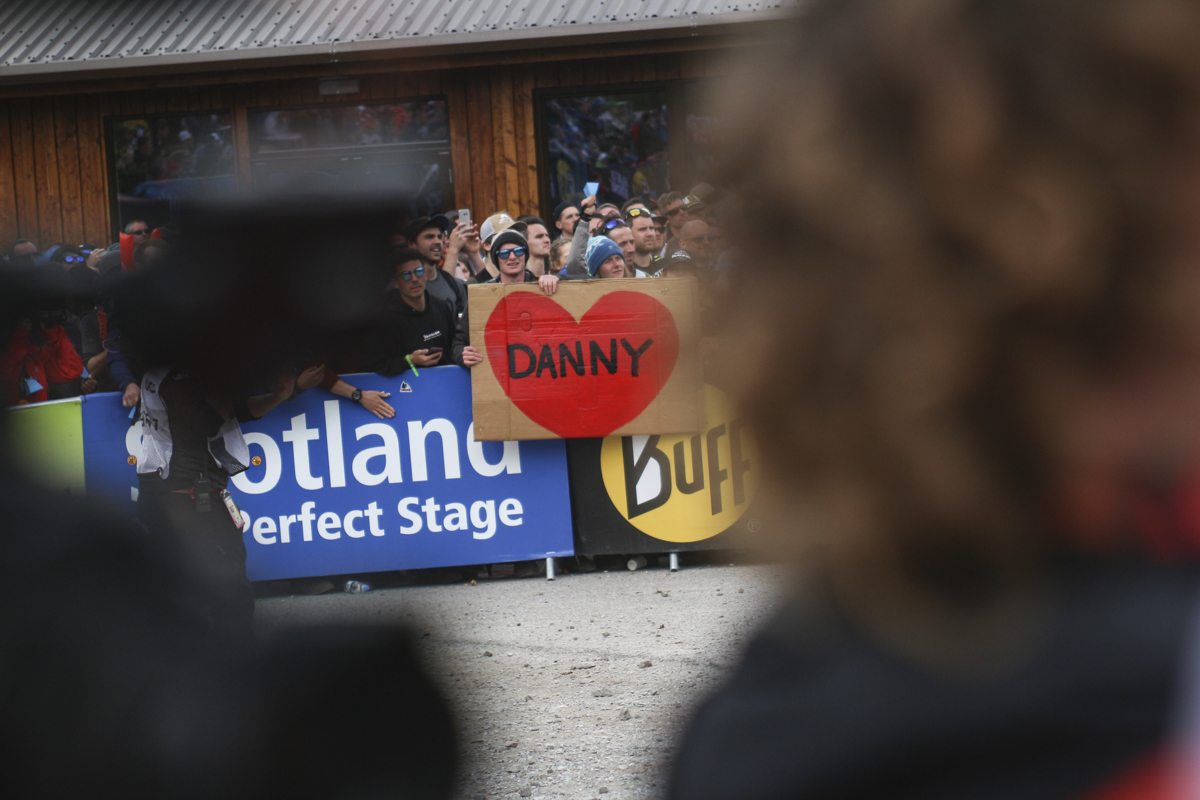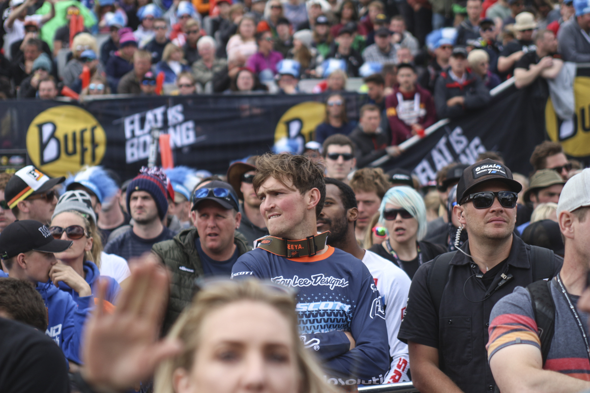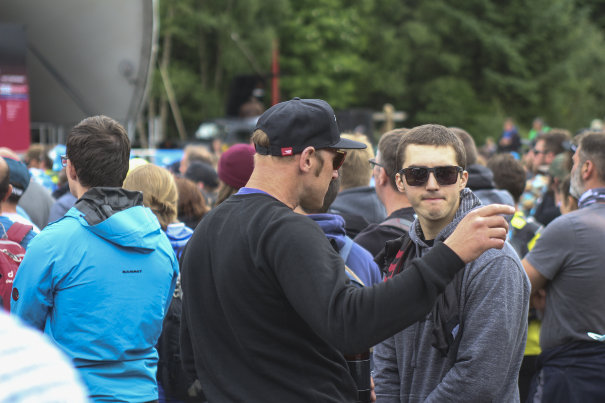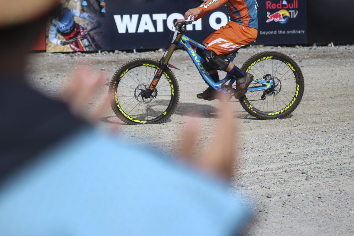 Sitting track-side, holding onto a camera, while the elite riders plummet to the bottom of the 2017 Fort William Downhill World Cup track was pretty damn exciting. The whiz of freehubs, and the occasional mouthful of roost as they fly by, is as close to the action as you can get. But although riders are at full tilt on all parts of the track, it’s the finish area where the real magic happens. From a rider’s point of view, the crowd’s track-side presence and the huge noise coming from the finish arena could be completely blanked out, to avoid any unwanted distractions, but for us spectators, it’s the crowd that act as the warning signal for those oncoming riders. The noise of cow-bells, clapping and all the ‘whoops and hollas’ you could ask for, mean some sweet two-wheeled action is coming your way, very soon.