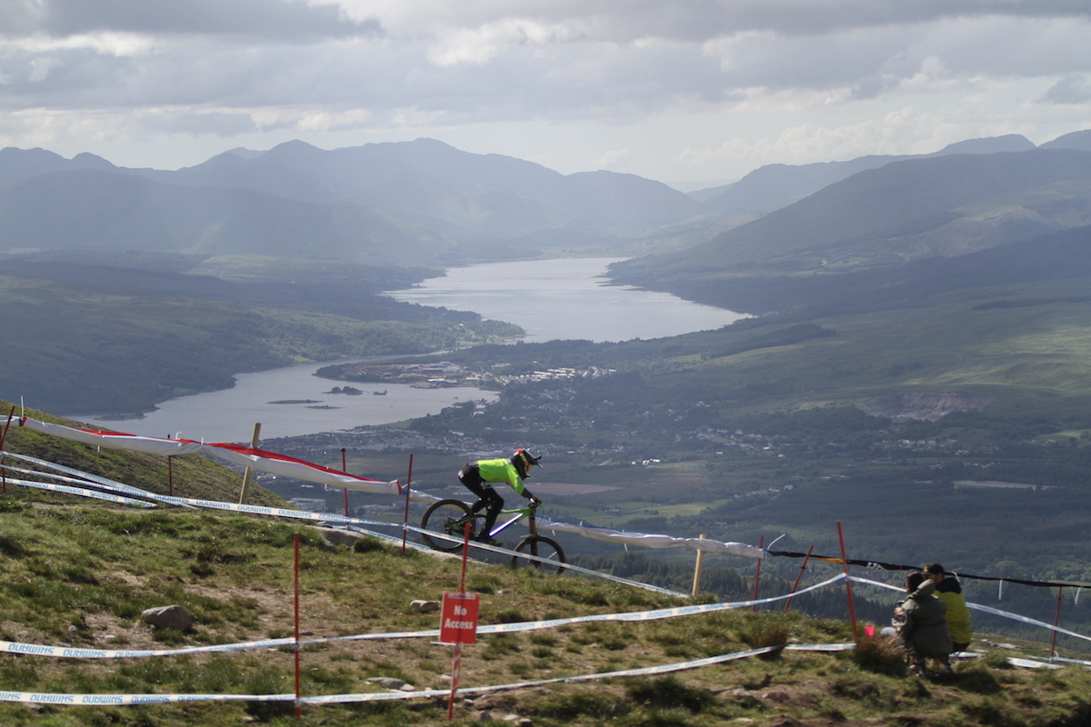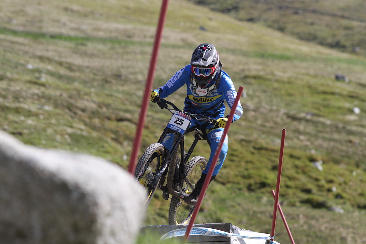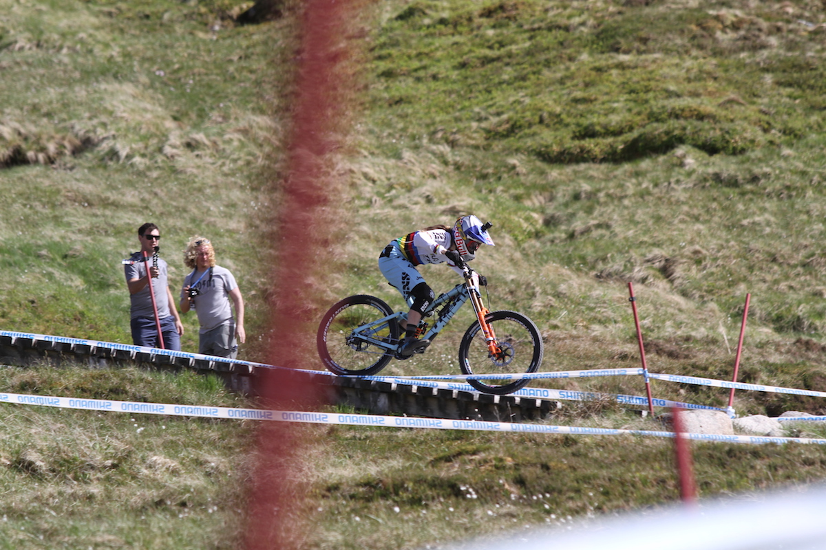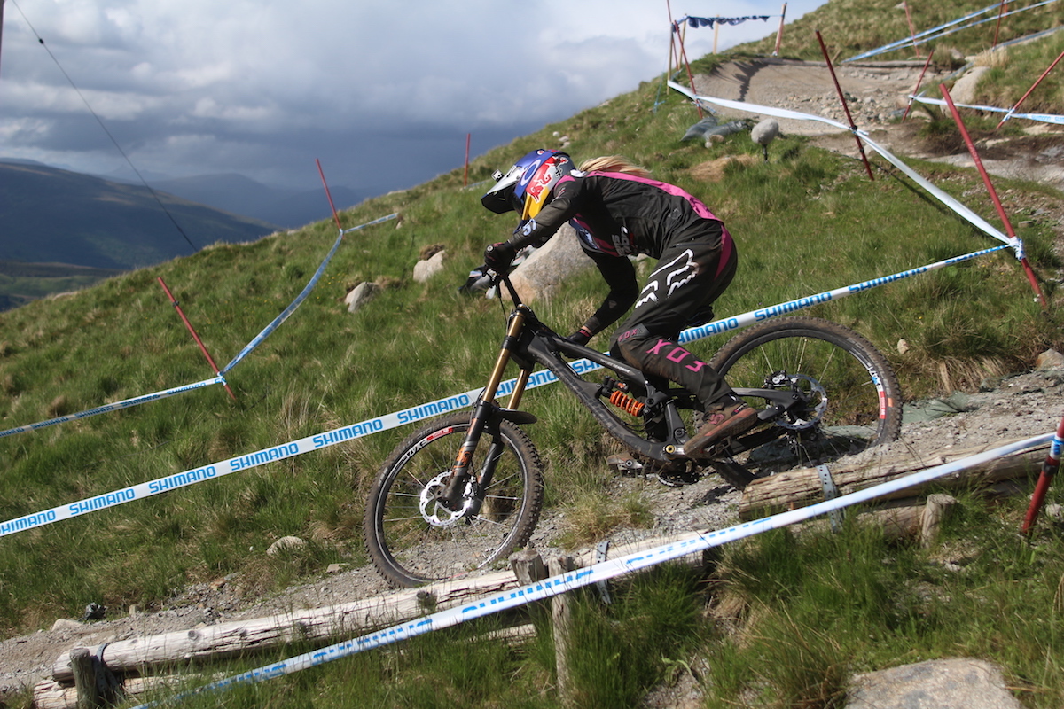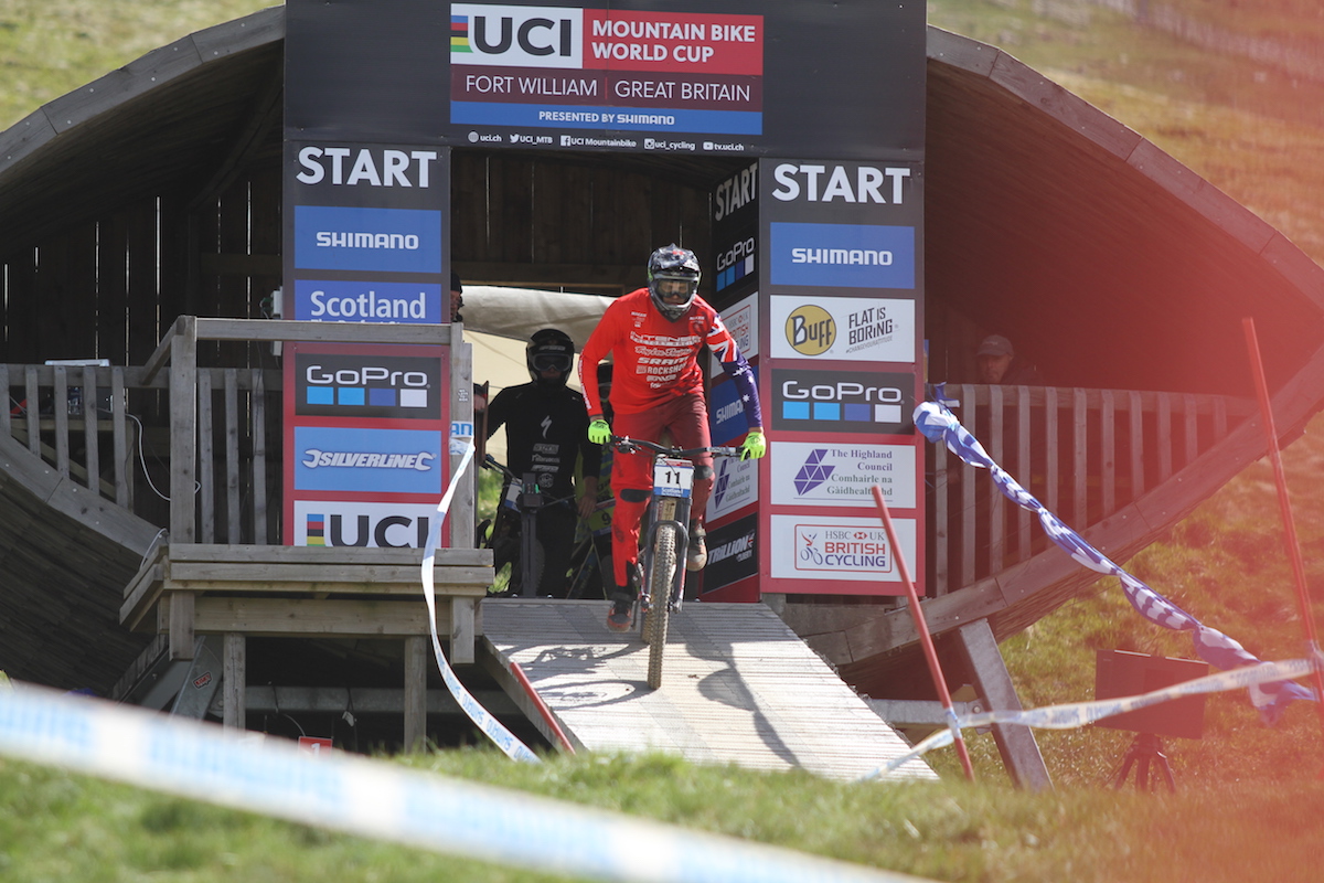 Riders waiting to drop in at the top of Fort Bill. Nerves breed like midges up here…Rachel Atherton sits at the top before her practice run. Looking calm, that’s for sure.The smiles continue with Laurie Greenland, who put down a blistering time to take top spot in timed practice.Jack Moir heads out of the start gate aboard his Intense alloy prototype 29er.The clock is ticking on timed practice as the top riders send it down the mountain.Jack Reading and his lead-equipped Nicolai Geometron flying through the rough stuff in the top section.Marshalls on course, with whistles at the ready and flasks of tea as standard.Loic Bruni shouts at fellow riders whilst the gonala comes to a halt.It’s the man-mountain himself, Sam Dale! Getting stylish through the rocks.