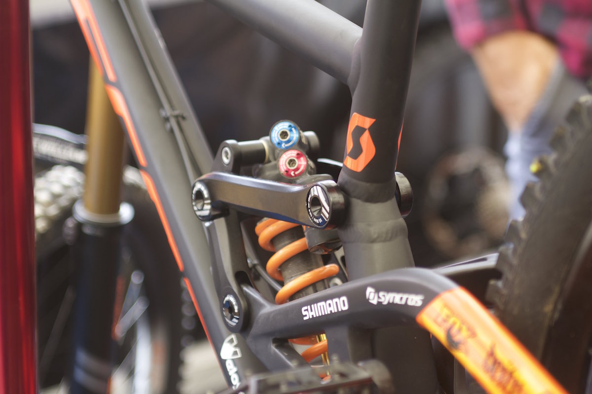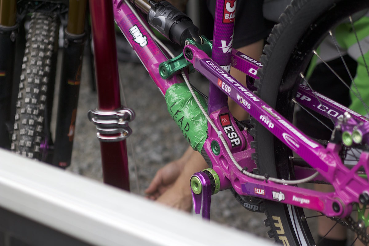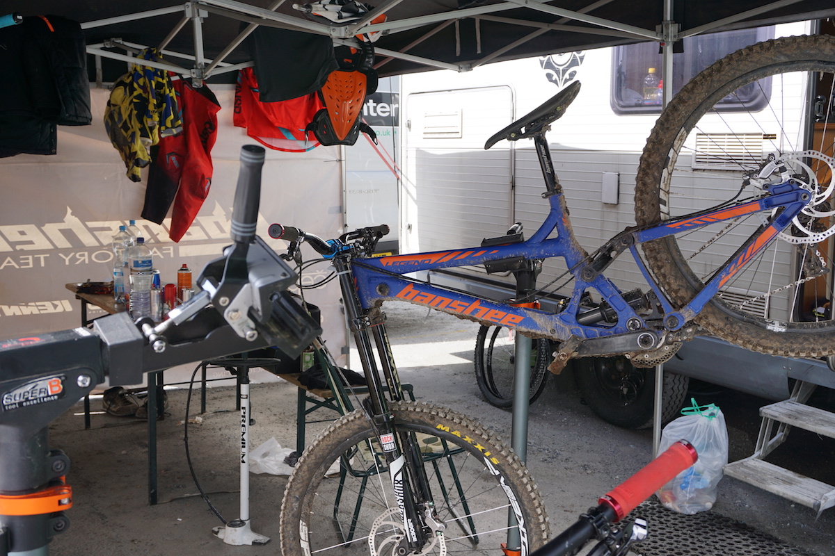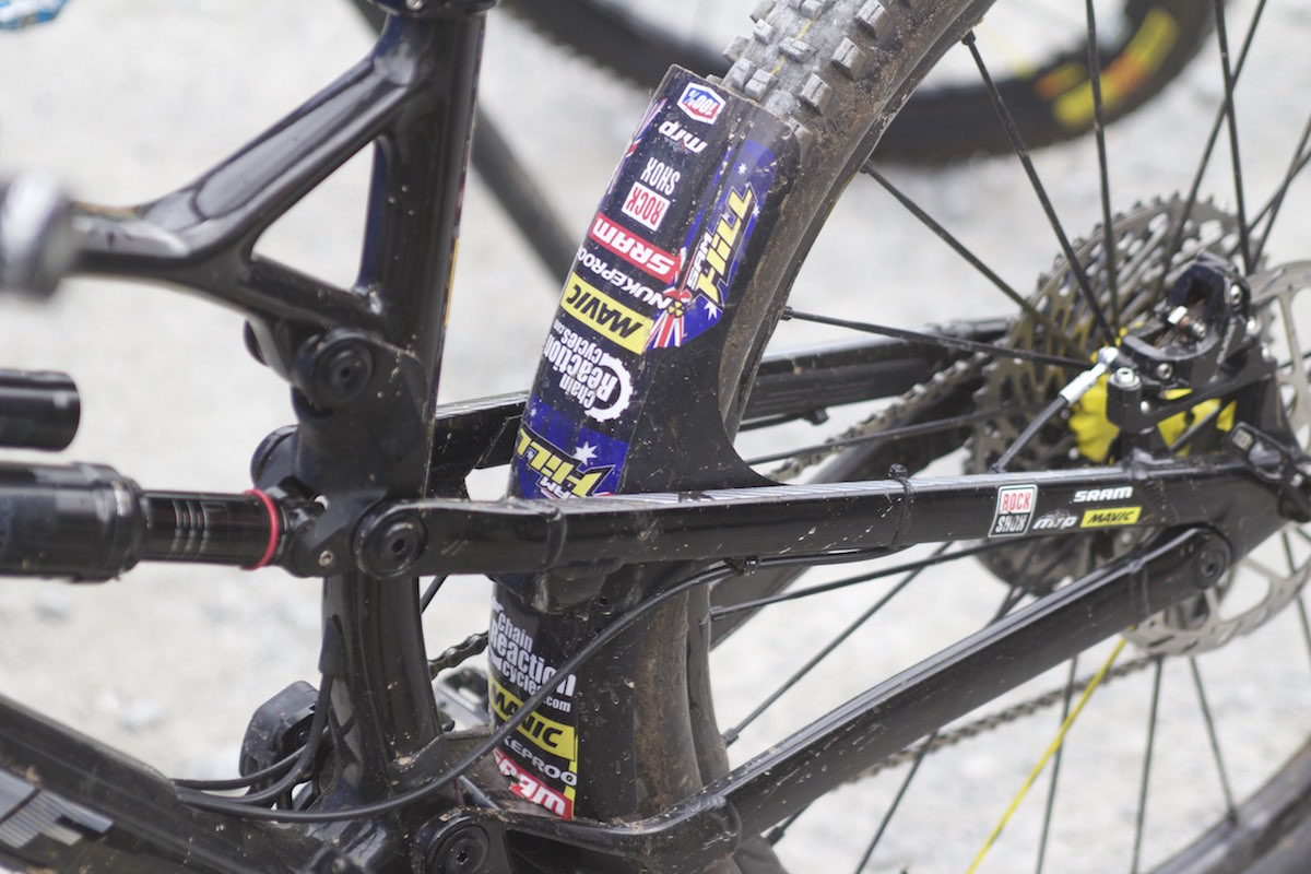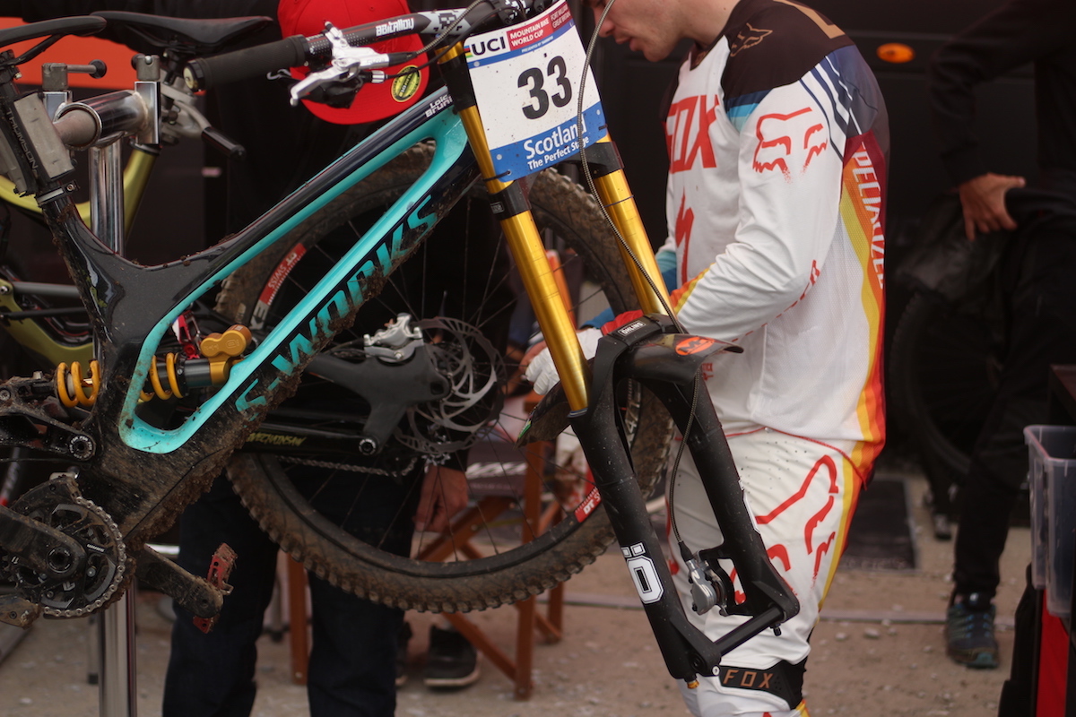 In the Polygon UR team pits, we spotted the Collosus DH9 downhill bike equipped with a rather strange-looking rear shock.The custom rear shock features a cable-activated arm that offers remote control of the compression damping.The shock is entirely custom, and it’s built by one of the team mechanics at Polygon.A standard Shimano XTR front shifter has been retrofitted to the shock’s remote lockout. Neat!Also in the Polygon race pits was this Collosus DH9 equipped with a full-blown telemetry setup for acquiring suspension data.A custom machined strut bolts onto the shock linkage to hold the piston rod for the telemetry unit.Tracey Hannah’s bike gets a tune-up in the workstand following her first practice run.Hannah battled traffic during practice day, but she was loving the course.Spank cockpit and Trickstuff brakes on Hannah’s Polygon Collosus DH9.German-made disc brakes from Trickstuff. According to the team mechanic, these are the best brakes they’ve used.Mick Hannah’s bike was getting a full rebuild, and we noticed some expanding foam inside the hollow downtube to help buffer the internal cabling to minimise noise and vibration. Quiet is smooth, and smooth is fast.Temperature gauge on the damper of Troy Brosnan’s RockShox Vivid Coil shock.Canyon brought double the number of spare wheels to Fort William. This track eats them for breakfast.Canyon head mechanic Nigel, has a very minimalist and lightweight toolbox for international travel.Bikes being checked for bar plugs before they’re allowed onto the gondola.There isn’t a lot of mud at Fort Bill this weekend, but what there is is sticky and stubborn.The privateer race pits are buzzing this weekend. Dedication from each and every athlete.The YT Mob is out in force this weekend, with the TUES carbon fibre downhill bike the chosen whip of team riders Neko Mulally and Aaron Gwin.The YT TUES team bikes are running powerful 4-pot TRP Quadiem G-Spec brakes.With 208mm of rear travel and 27.5in wheels, will the YT Mob’s TUES race bikes be able to match the speed of the 29ers this weekend?Speaking of 29ers, how’s the carbon Specialized Demo prototype that Loic Bruni is racing this weekend?Bruni’s bike runs a Joystick cockpit including a tidy direct-mount stem.Bruni gets his own signature lock-on grips from Lizard Skins. Like the rest of the Specialized Gravity Team, he’s also running Formula Cura brakes front and rear.Bruni’s also been spotted aboard this carbon demo equipped with full-blown telemetry setup.A custom carbon fibre back end on the computerised Demo? Note the sensor for the rear hydraulic brake line, and an interesting upper jockey wheel on Bruni’s rear derailleur too…Telemetry setup for the Ohlins dual-crown fork up front.Also in the Specialized race pits was this gold anodized fork from Ohlins. The Swedish suspension company is testing and developing a lot of prototype gear here at Fort Bill.The bike for one of the fastest mountain bikers on the planet.Gwin’s race bike is running Fox air-sprung suspension front and rear, with carbon E*thirteen wheels and Onza tyres.Gwin’s mechanic ensures everything is tip-top before practice.Preparation in the Trek Factory Racing pits.Rachel Atherton’s new Session 9.9 RSL gets a checking over following her practice runs on the mountain.Her brother Gee is out of action following a dislocated hip caused by a crash at the Fort William round of the British Downhill Series. So his teammate Graeme Mudd has borrowed the Session 29er for a blast this weekend.29ers are changing the game on the downhill World Cup series. The riders on the big wheels are looking FAST!Also spotted in the Trek race pits was this interesting device mounted to the rear disc brake callipers.Turns out it’s a brake silencer. Using a machined alloy housing, the unit holds a brass weight suspended inside an elastomer ring that helps to dissipate vibrations to allow for a quieter bike with less braking noise. According to the team mechanics, it plays a large role in helping riders concentrate on the trail ahead.Aussie fast man, Sam Hill, took a break from the Enduro World Series to race the Fort Bill round aboard his Nukeproof Pulse.Sam Hill may not be a regular sight on the World Cup downhill circuit anymore, but people notice when he does saddle up on the start line.Sam also had his Nukeproof Mega 275 on display at Fort Bill, complete with moto guards for the brake levers.The Mega 275 that Sam is racing on is a prototype carbon fibre bike – essentially a carbon version of the existing alloy Mega 275. We’re eagerly awaiting for more details on the new bike, but for the time being we can ogle at its lovely lines and that sweet custom mudguard on the rear.Mechanics are flat-out at Fort Bill, keeping racer’s bikes in race-ready condition all weekend long.How’s this setup for the Dude Of Hazzard himself; Joe Barnes?Juliana released the brand new Strega on Thursday, and Santa Cruz had one on display at the Fort William World Cup. The 170mm travel beast looks mean in the flesh.The new Nomad also made a cameo, in that discreet ‘Ink’ colour that is our pick of the bunch.A closer look at those new Santa Cruz carbon wheels.The rulers are out!Young Frenchman, Loris Vergier, gets a final check on his prototype Santa Cruz V10 29er.Seen out the back of the Syndicate race pits were these funny-looking e-bikes.Cube’s Greg Williamson is ready to take his Two15 downhill bike up onto the chairlift and onto the brutal Fort Bill track.Who does this belong to then?That would be Tahnee Seagrave, who’s rocking a carbon fibre prototype Transition downhill bike this weekend at Fort Bill.‘Quick, into the workshop!’Patriotic spoke nipples on the Novatec wheels of Connor Fearon’s Kona Operator.Brendog is testing a prototype linkage on his Scott Gambler race bike. The plates offer a much harder ramp-up at the end, which means the bike sits deeper into its sag too.The Gambler frame offers adjustable c