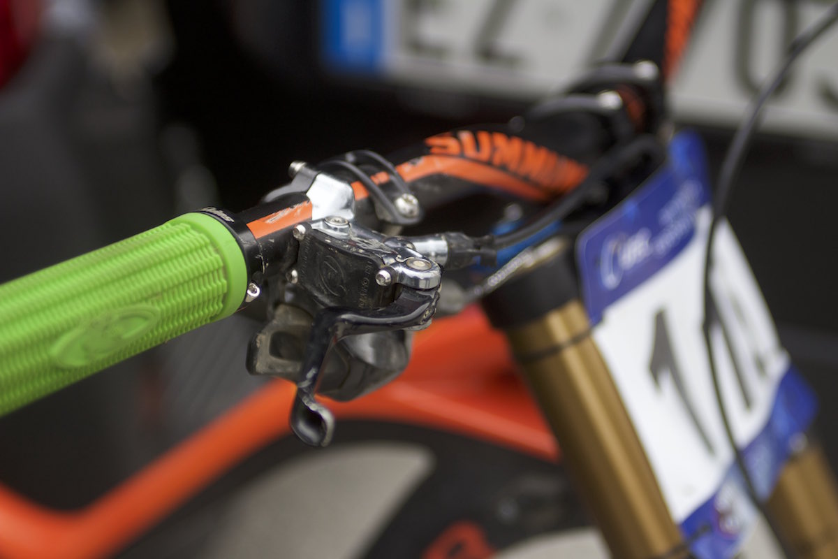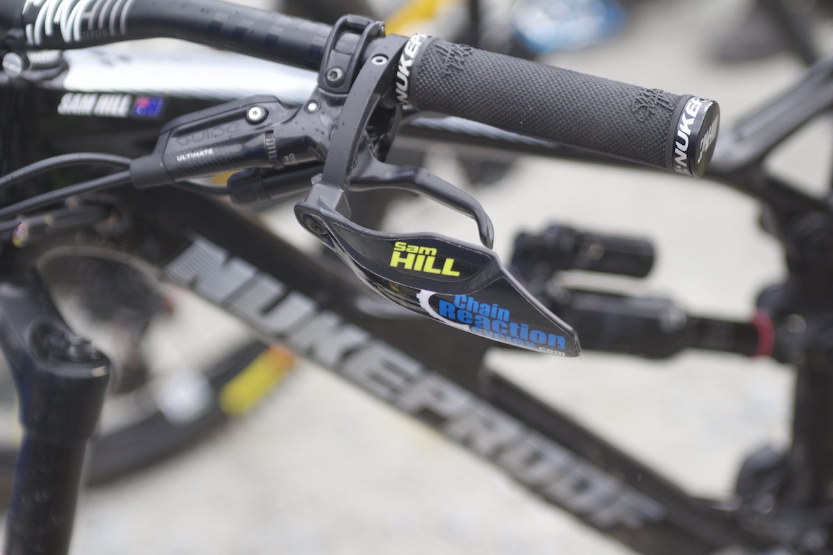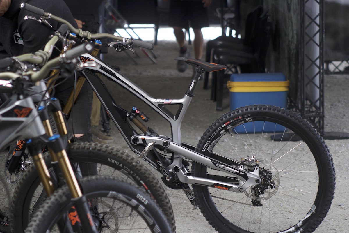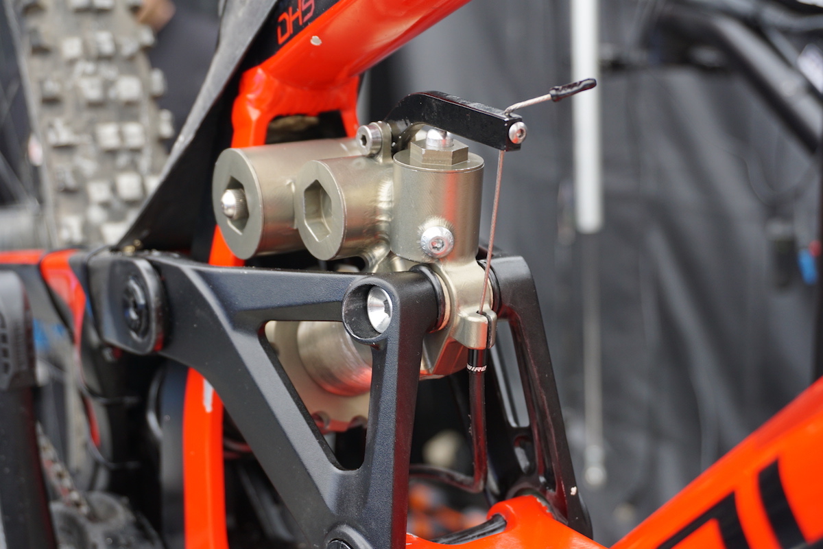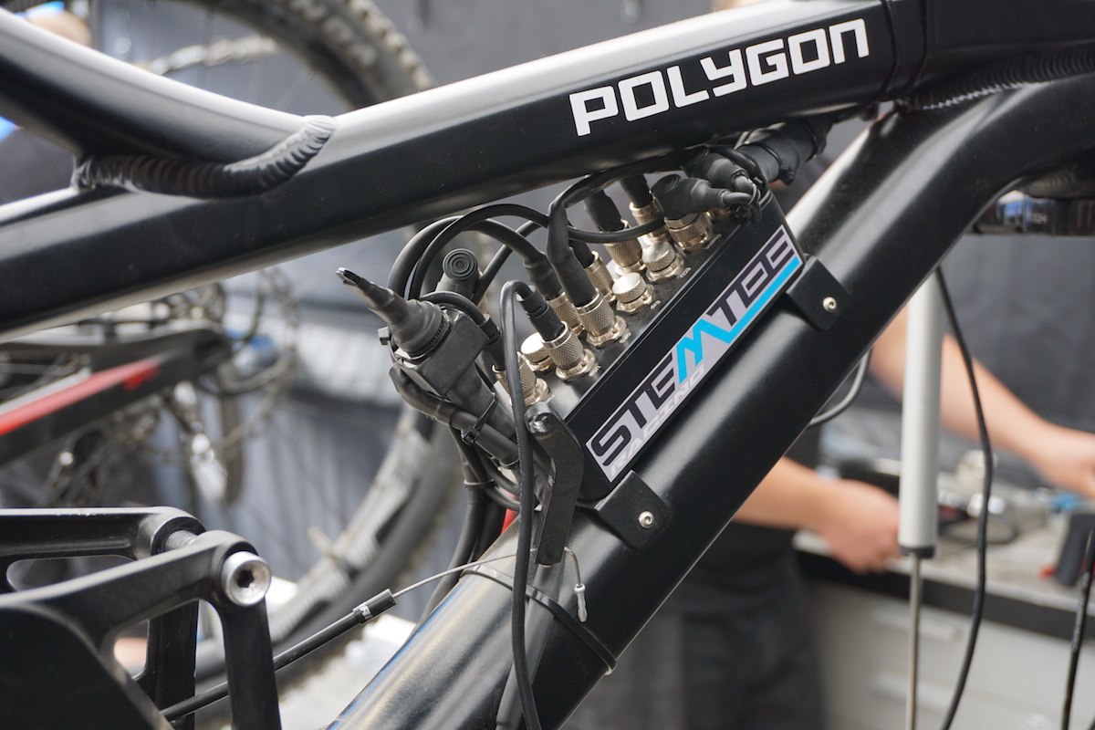 In the Polygon UR team pits, we spotted the Collosus DH9 downhill bike equipped with a rather strange-looking rear shock.The custom rear shock features a cable-activated arm that offers remote control of the compression damping.The shock is entirely custom, and it’s built by one of the team mechanics at Polygon.A standard Shimano XTR front shifter has been retrofitted to the shock’s remote lockout. Neat!Also in the Polygon race pits was this Collosus DH9 equipped with a full-blown telemetry setup for acquiring suspension data.A custom machined strut bolts onto the shock linkage to hold the piston rod for the telemetry unit.Tracey Hannah’s bike gets a tune-up in the workstand following her first practice run.Hannah battled traffic during practice day, but she was loving the course.Spank cockpit and Trickstuff brakes on Hannah’s Polygon Collosus DH9.German-made disc brakes from Trickstuff. According to the team mechanic, these are the best brakes they’ve used.Mick Hannah’s bike was getting a full rebuild, and we noticed some expanding foam inside the hollow downtube to help buffer the internal cabling to minimise noise and vibration. Quiet is smooth, and smooth is fast.Temperature gauge on the damper of Troy Brosnan’s RockShox Vivid Coil shock.Canyon brought double the number of spare wheels to Fort William. This track eats them for breakfast.Canyon head mechanic Nigel, has a very minimalist and lightweight toolbox for international travel.Bikes being checked for bar plugs before they’re allowed onto the gondola.There isn’t a lot of mud at Fort Bill this weekend, but what there is is sticky and stubborn.The privateer race pits are buzzing this weekend. Dedication from each and every athlete.The YT Mob is out in force this weekend, with the TUES carbon fibre downhill bike the chosen whip of team riders Neko Mulally and Aaron Gwin.The YT TUES team bikes are running powerful 4-pot TRP Quadiem G-Spec brakes.With 208mm of rear travel and 27.5in wheels, will the YT Mob’s TUES race bikes be able to match the speed of the 29ers this weekend?Speaking of 29ers, how’s the carbon Specialized Demo prototype that Loic Bruni is racing this weekend?Bruni’s bike runs a Joystick cockpit including a tidy direct-mount stem.Bruni gets his own signature lock-on grips from Lizard Skins. Like the rest of the Specialized Gravity Team, he’s also running Formula Cura brakes front and rear.Bruni’s also been spotted aboard this carbon demo equipped with full-blown telemetry setup.A custom carbon fibre back end on the computerised Demo? Note the sensor for the rear hydraulic brake line, and an interesting upper jockey wheel on Bruni’s rear derailleur too…Telemetry setup for the Ohlins dual-crown fork up front.Also in the Specialized race pits was this gold anodized fork from Ohlins. The Swedish suspension company is testing and developing a lot of prototype gear here at Fort Bill.The bike for one of the fastest mountain bikers on the planet.Gwin’s race bike is running Fox air-sprung suspension front and rear, with carbon E*thirteen wheels and Onza tyres.Gwin’s mechanic ensures everything is tip-top before practice.Preparation in the Trek Factory Racing pits.Rachel Atherton’s new Session 9.9 RSL gets a checking over following her practice runs on the mountain.Her brother Gee is out of action following a dislocated hip caused by a crash at the Fort William round of the British Downhill Series. So his teammate Graeme Mudd has borrowed the Session 29er for a blast this weekend.29ers are changing the game on the downhill World Cup series. The riders on the big wheels are looking FAST!Also spotted in the Trek race pits was this interesting device mounted to the rear disc brake callipers.Turns out it’s a brake silencer. Using a machined alloy housing, the unit holds a brass weight suspended inside an elastomer ring that helps to dissipate vibrations to allow for a quieter bike with less braking noise. According to the team mechanics, it plays a large role in helping riders concentrate on the trail ahead.Aussie fast man, Sam Hill, took a break from the Enduro World Series to race the Fort Bill round aboard his Nukeproof Pulse.Sam Hill may not be a regular sight on the World Cup downhill circuit anymore, but people notice when he does saddle up on the start line.Sam also had his Nukeproof Mega 275 on display at Fort Bill, complete with moto guards for the brake levers.The Mega 275 that Sam is racing on is a prototype carbon fibre bike – essentially a carbon version of the existing alloy Mega 275. We’re eagerly awaiting for more details on the new bike, but for the time being we can ogle at its lovely lines and that sweet custom mudguard on the rear.Mechanics are flat-out at Fort Bill, keeping racer’s bikes in race-ready condition all weekend long.How’s this setup for the Dude Of Hazzard himself; Joe Barnes?Juliana released the brand new Strega on Thursday, and Santa Cruz had one on display at the Fort William World Cup. The 170mm travel beast looks mean in the flesh.The new Nomad also made a cameo, in that discreet ‘Ink’ colour that is our pick of the bunch.A closer look at those new Santa Cruz carbon wheels.The rulers are out!Young Frenchman, Loris Vergier, gets a final check on his prototype Santa Cruz V10 29er.Seen out the back of the Syndicate race pits were these funny-looking e-bikes.Cube’s Greg Williamson is ready to take his Two15 downhill bike up onto the chairlift and onto the brutal Fort Bill track.Who does this belong to then?That would be Tahnee Seagrave, who’s rocking a carbon fibre prototype Transition downhill bike this weekend at Fort Bill.‘Quick, into the workshop!’Patriotic spoke nipples on the Novatec wheels of Connor Fearon’s Kona Operator.Brendog is testing a prototype linkage on his Scott Gambler race bike. The plates offer a much harder ramp-up at the end, which means the bike sits deeper into its sag too.The Gambler frame offers adjustable c