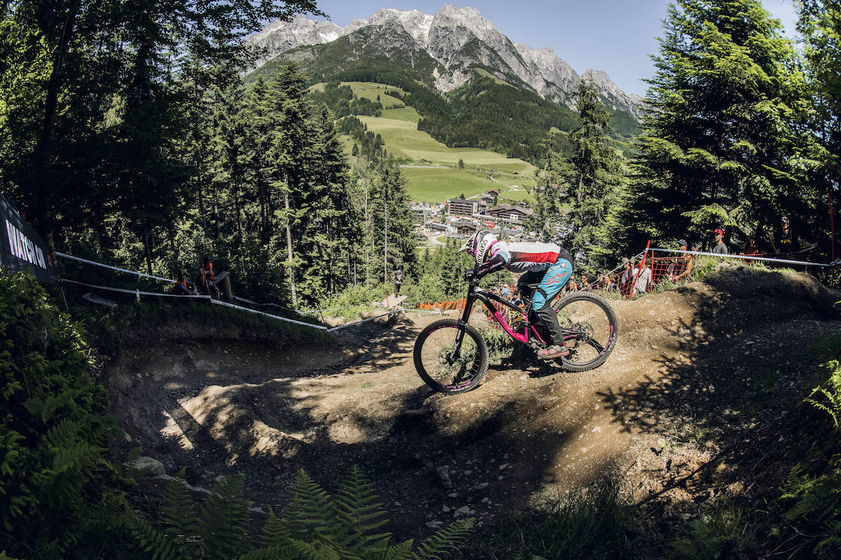 In the men’s race, two fast Frenchmen were missing. Remi Thirion was recovering in a Salzburg hospital after having a massive crash during qualifying, whilst Loïc Bruni had sustained a nasty haematoma on his thigh. The action arrived thick and fast with one of the stars of the previous round, Jack Moir, landing in the hot seat despite a crash towards the top of the track. Britain’s Bernard Kerr was the next occupant and would be rewarded for his stellar run with fifth place when all was said and done.