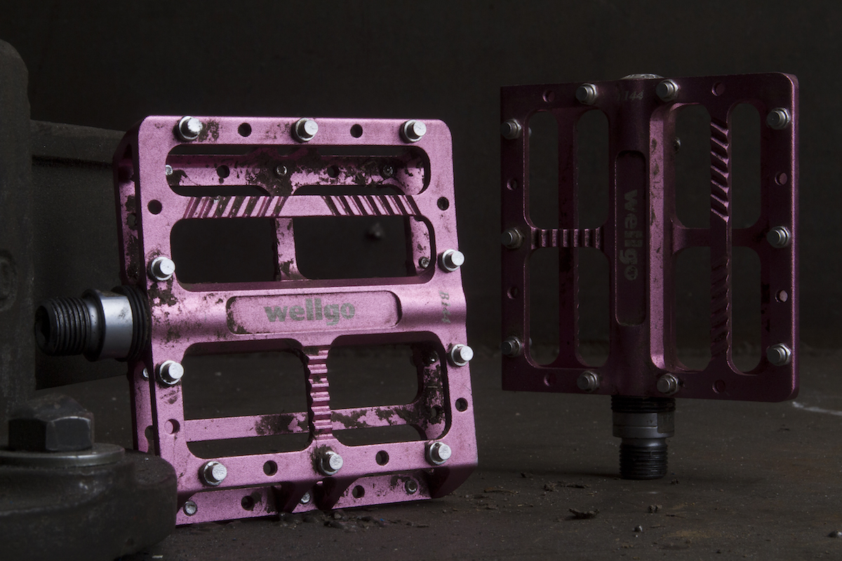 Despite Wellgo’s website claiming CNCed bodies, the light sand texture seems to indicate a casting, with the shapes in the body accordingly basic and unfussy. The surface texture is visible, perceptible to a fingertip, and holds on to filth just that tiny bit more, but wasn’t detrimental in terms of them shedding most muck on wet rides.