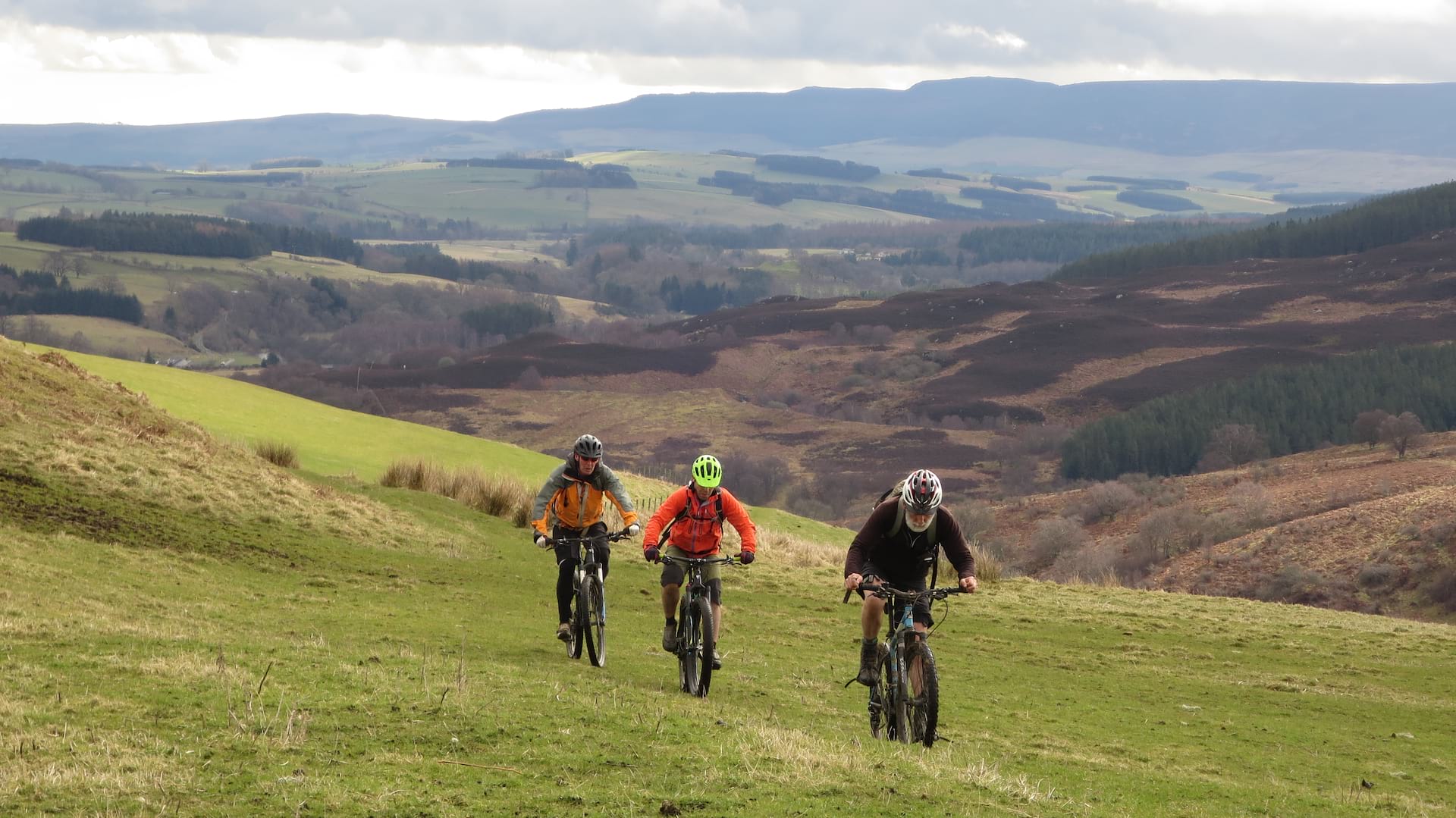 At this point, gremlins appear from stage left – the logging guy tells us that a chunk of our proposed trail for the next section is currently closed as it’s buried under a couple of thousand tons of timber. This is a shame; the loop we had planned includes a stonking descent down to the tiny settlement of Barrowburn (although it would have also included a second attempt of the post-lunch climb, so maybe we lucked out after all…).