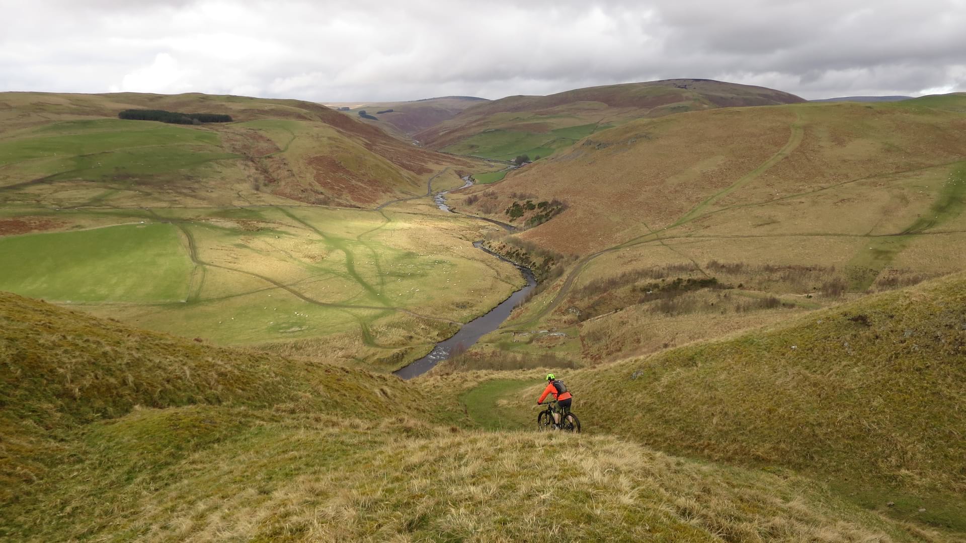 This isn’t the most pleasant surface to ride on, but it’s pretty fast and we’re soon off the end and standing at the top of the final descent with an amazing view over the hills of Northumberland stretching away into the distance.