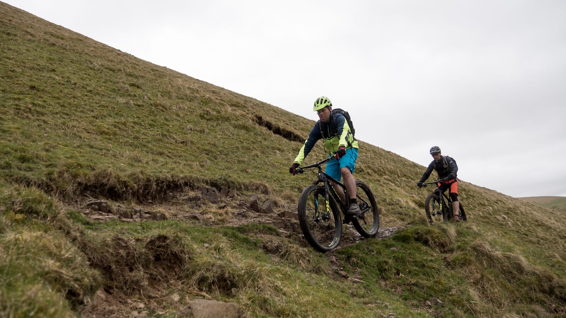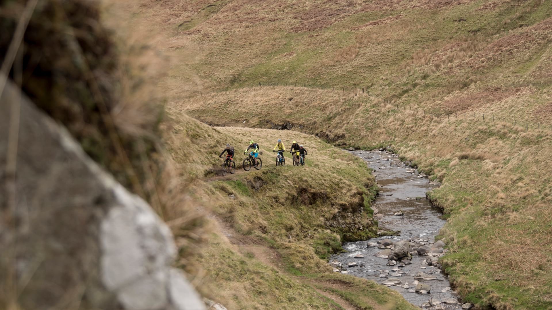 We spin our way up the valley. Colin, one of the Muddybums gang, pops manuals over the bridges as easily as normal riders change gear. At the head of the valley the 4×4 track stops and the fun begins. The trail starts wide, fast and grassy, but as it heads for the right-hand side of the valley it narrows to the correct width for a mountain bike trail and climbs away from the stream. The trail hugs the side of the valley and undulates perfectly to give a good dose of pop and flow to proceedings. There are a couple of narrow sections where a bit of body English is needed to keep your wheels planted on terra firma rather than slipping off the side into the stream (now quite a long way below), but there’s nothing too terrifying and it is lots of fun – what more could you ask for?