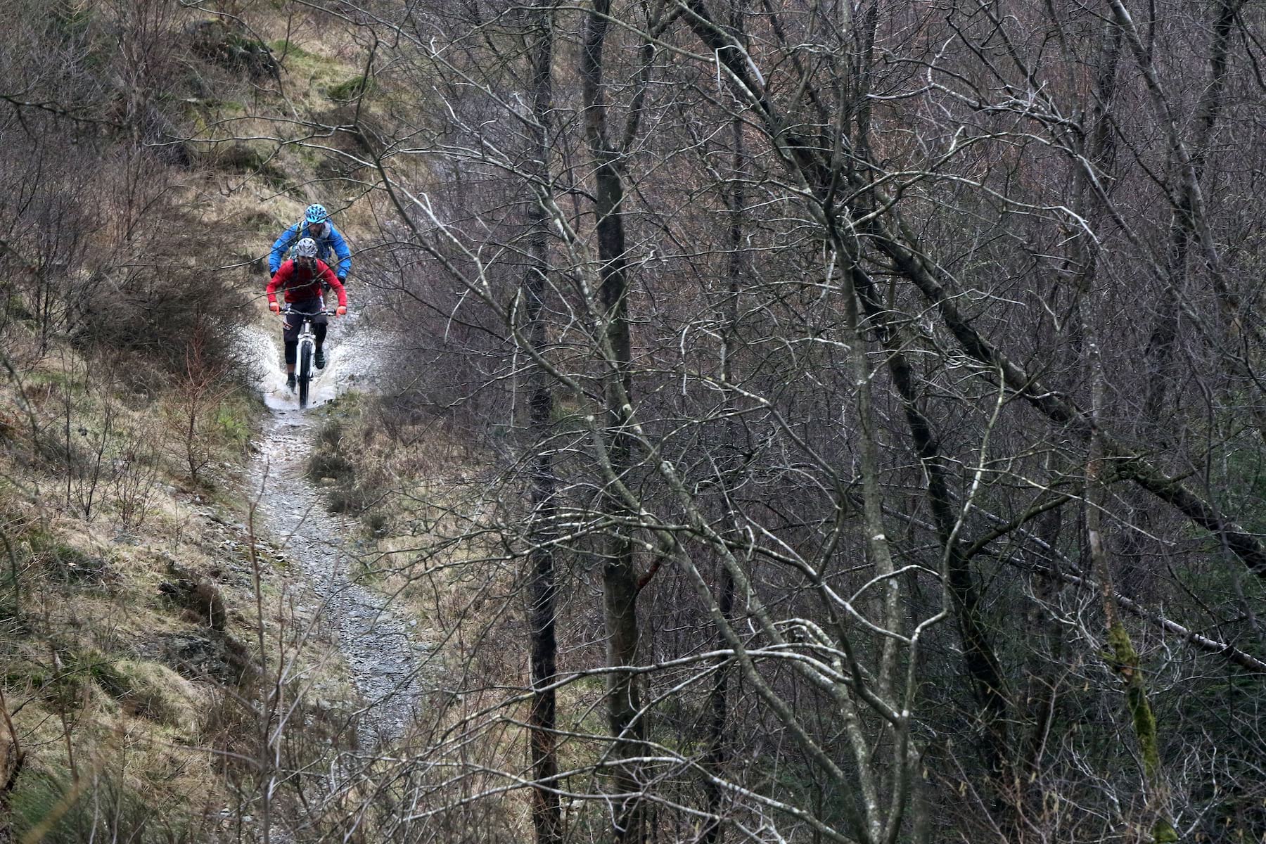 Halfway down is a small copper-coloured slab – a little pop at the top and you float across the rock with ease, landing at warp speed and blasting on down the trail. At the bottom all hell breaks loose as the trail tips and plunges steeply to the road. Today, though, there’s a shock: they’ve been felling in the area and the worryingly steep mix of roots, rocks and awkward corners has vanished. The initial tangle of roots remains, but after you’ve rattled through that you’re left with a wideish trail that makes a couple of turns and deposits you at the bottom. What a shame. Still, it hopefully won’t be long before the Lake District weather and a few hundred tyres restore the trail to its former glory.