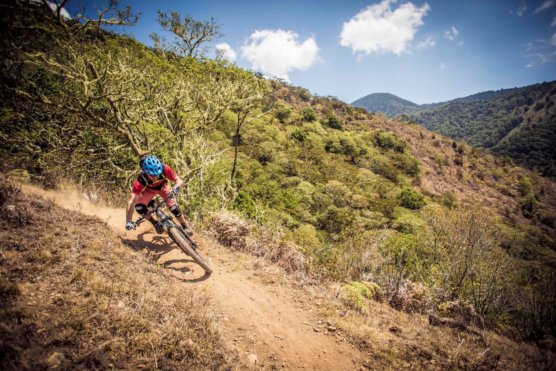 Paulo’s next pride and joy is a trail further south, in Providencia. We’ve barely gotten out of the truck and we’re lost again in a mixture of jungle, dust and hairpin bends. A few steep ledges and roots block the way. We stop for a moment in the clearing. It’s similar to Europe; open meadows amid forests and undulating terrain – a little bit of the Black Forest in the middle of Central America.