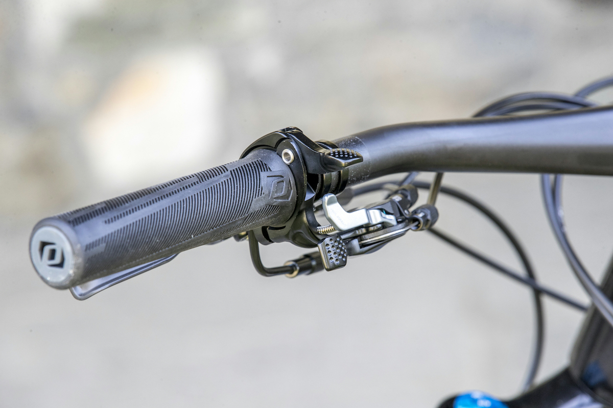 Up at the bars you’ll find a 3-position suspension lever that offers Open, Traction and Lockout settings. The lever connects to the fork as well, so it simultaneously adjusts both the fork and shock at the same time. In the Traction mode, the fork remains at 150mm travel, but simply has the compression setting wound up to firm the travel. For the rear shock, an air chamber is blocked off that limits the travel down to 130mm. Lockout mode is exactly that – fully locked front and rear.