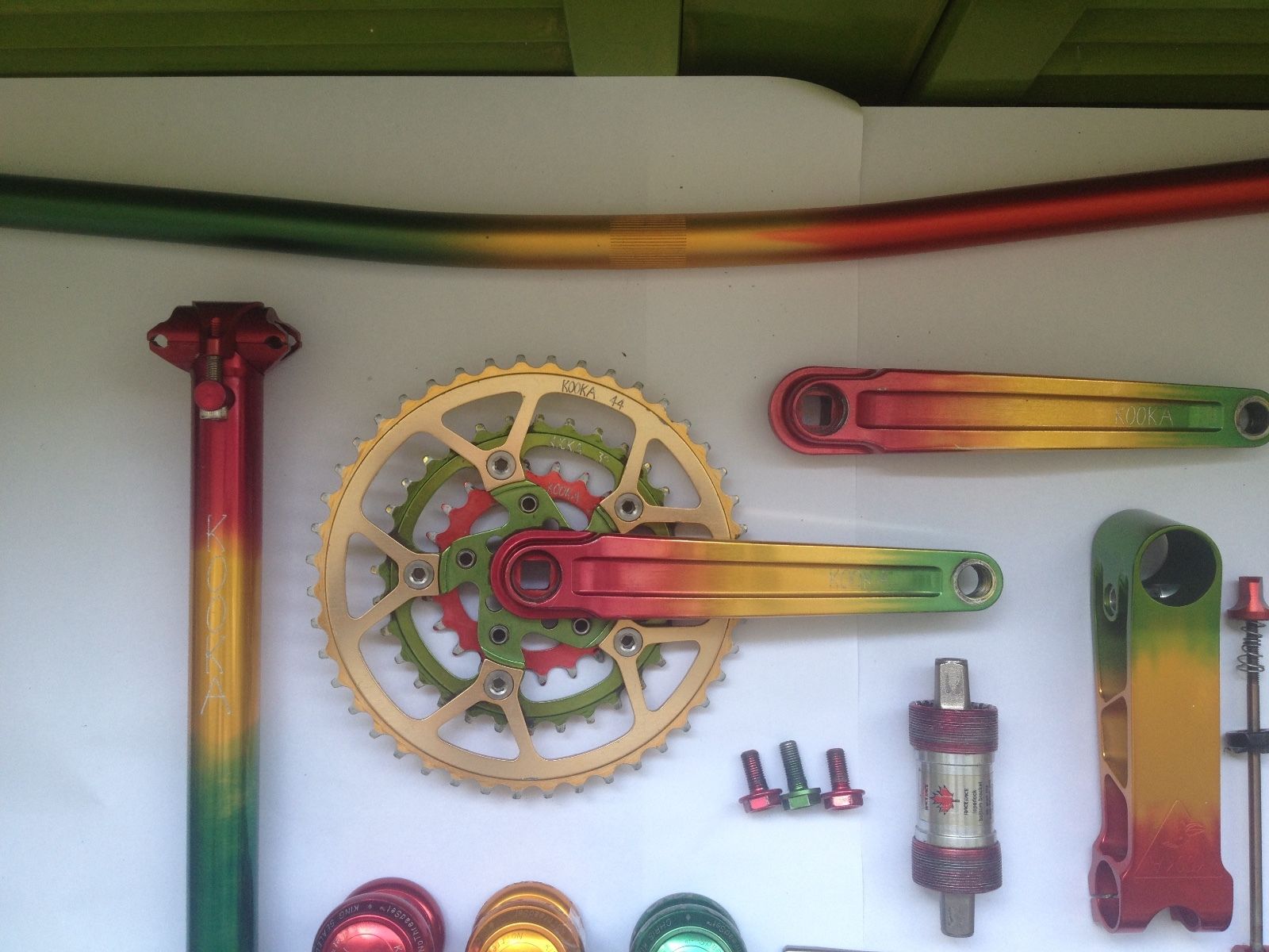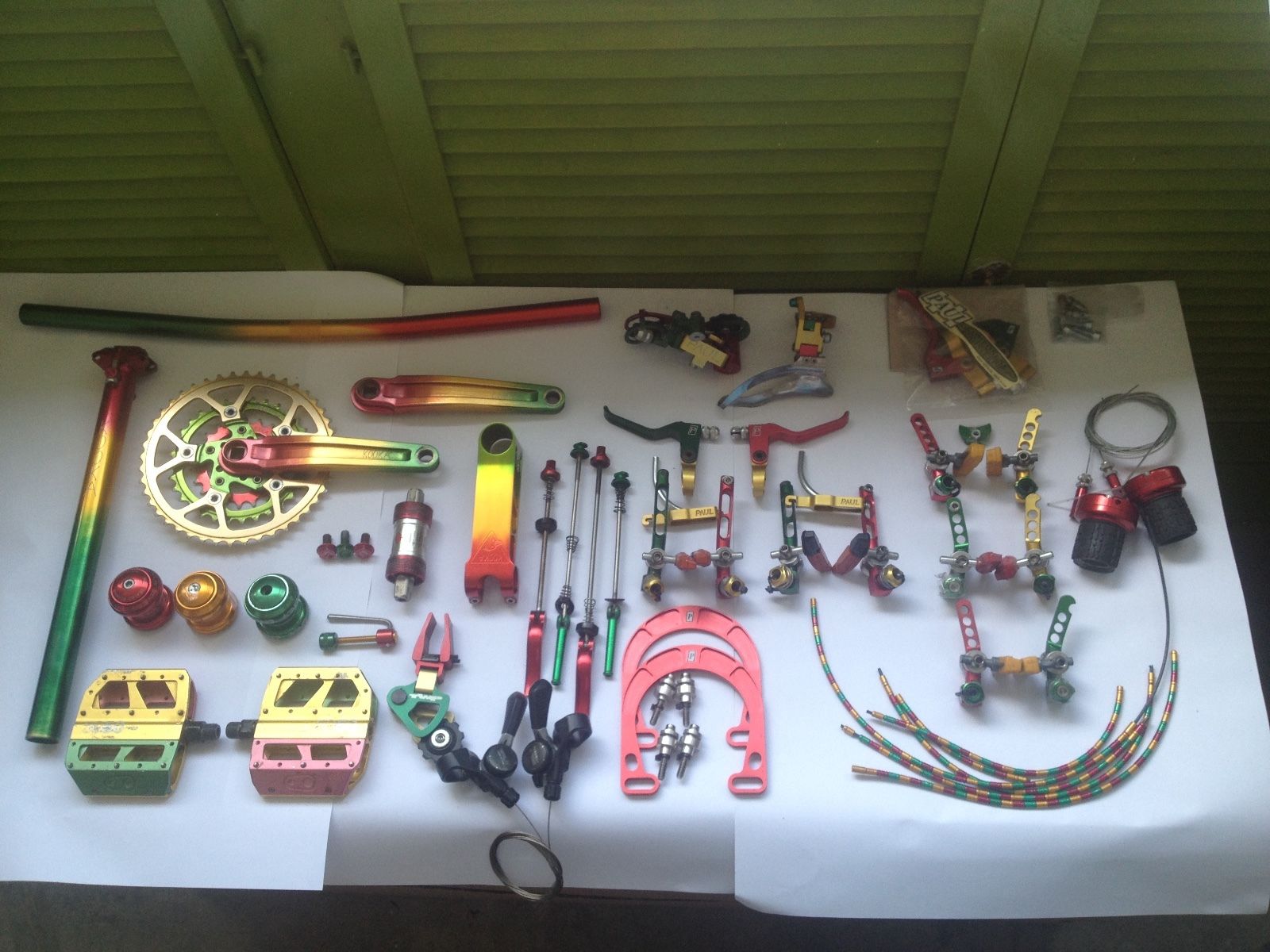 We’re sure this is old news in Retro Bike Land, but we’ve just stumbled upon this listing for a collection of mid-90s mountain bike components from well-known manufacturers like Paul’s Components, Kooka and Chris King. They all have the Rasta-style colours of red, yellow and green in common, and they’re all apparently pretty secondhand and used. However, with plain silver Paul’s rear mechs alone going for several hundred quid, getting all this lot together in one place is quite the retro-happening. And it’s reflected in the price – coming in at the ‘well-heeled collectors only bracket.