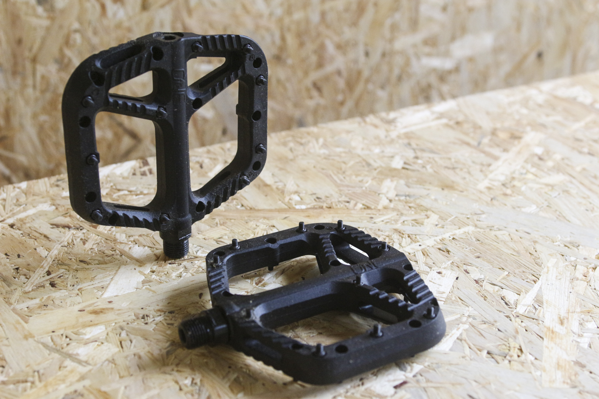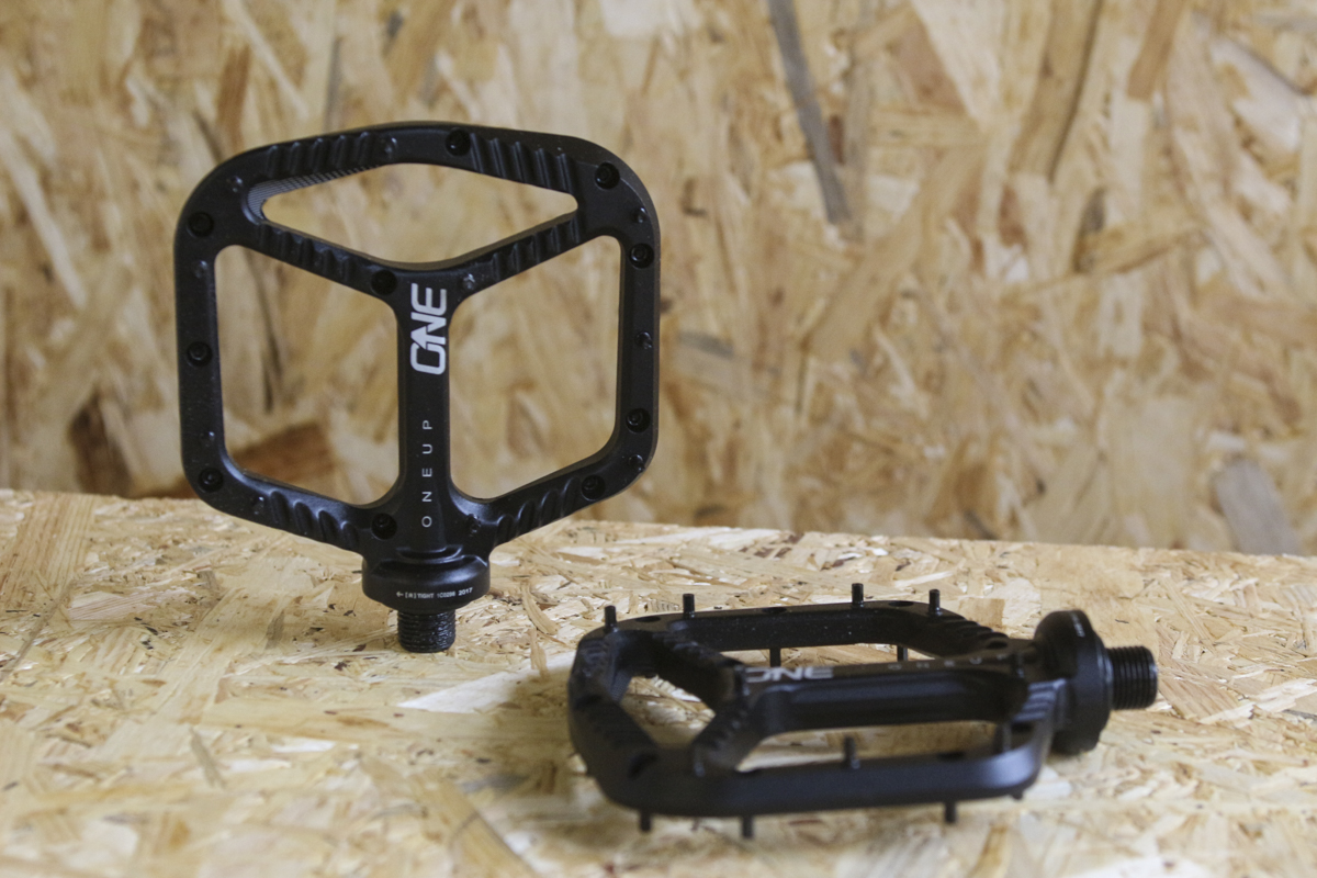 This is a composite flat pedal from OneUp. They feature 10 metal pins on each side that thread into captive Nylock nuts, and have a platform size of 115 x 105mm. This pedal is 18mm thick.