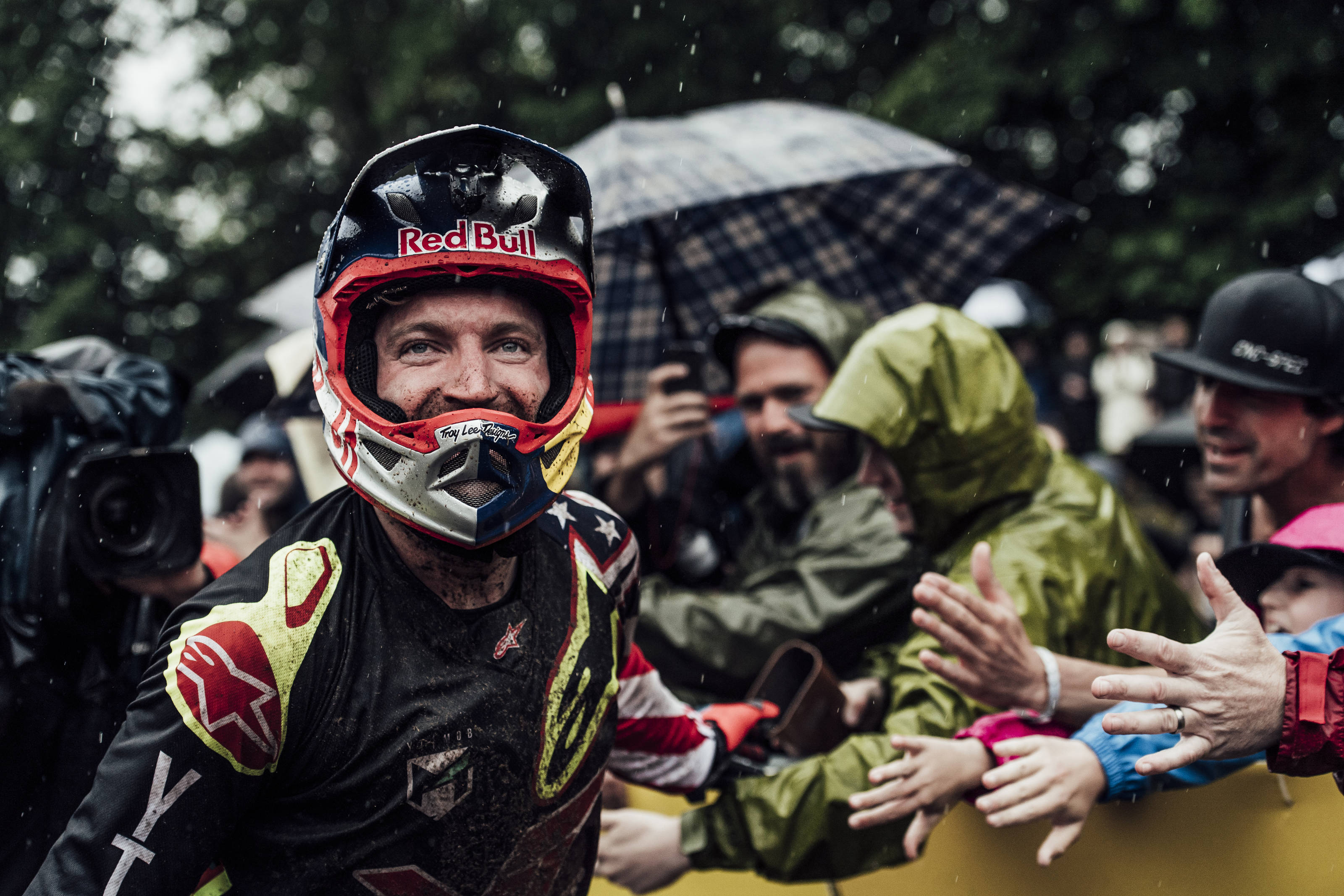 Danny Hart managed to pull off a fast wet run, unsurprisingly, for 3rd spot, but it was Aaron Gwin who ultimately took the win with green lights all the way down the mountain and at one point 2 seconds up on the field.