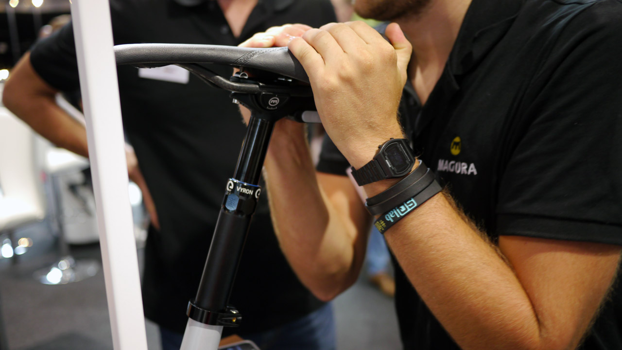 One of the criticisms levelled against the first version of the Vyron was the delay of about 0.5 seconds, which most riders got used to but was nonetheless noticeable. A demo station on the Magura stand had a newer version of the Vyron with sped up electronics. There’s still a slight delay, but it is a great deal closer to the timing you’d expect from a regular cabled or oil-remote dropper post.