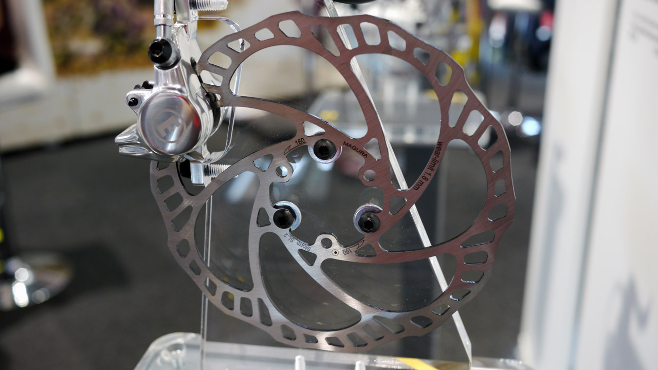 Magura’s rotors have been tweaked a little and harmonised so all of them can be run with all of their brakes. All are 2mm thick, but the Storm HC rotors are more heavyweight and the Storm SL.2 designed for people who want to save a bit of weight. All can be used with 2- or 4-pot calipers, and while the HC comes in 160mm, 180mm, and 203mm, the SL.2 is only 160 or 180mm – apparently the large cutouts meant they couldn’t get a 203mm version stiff enough, so they decided not to send the prototype into production.