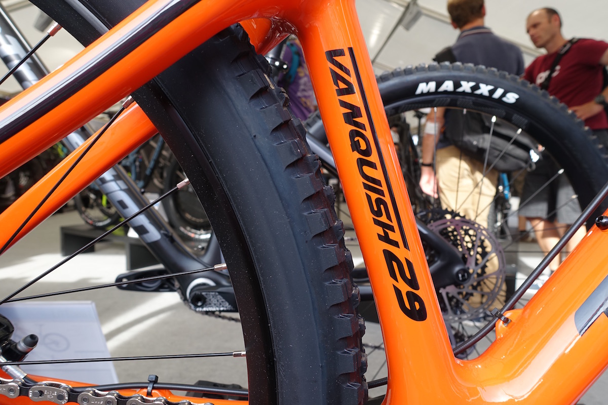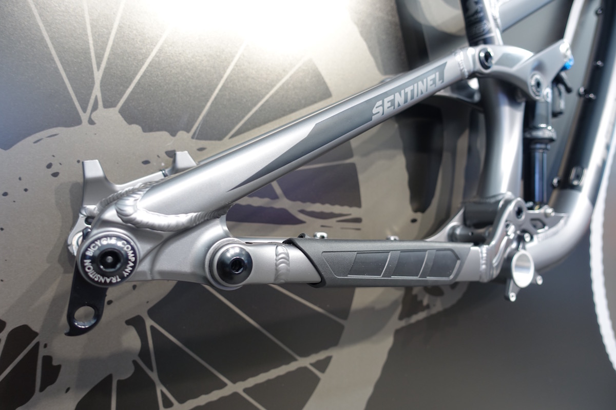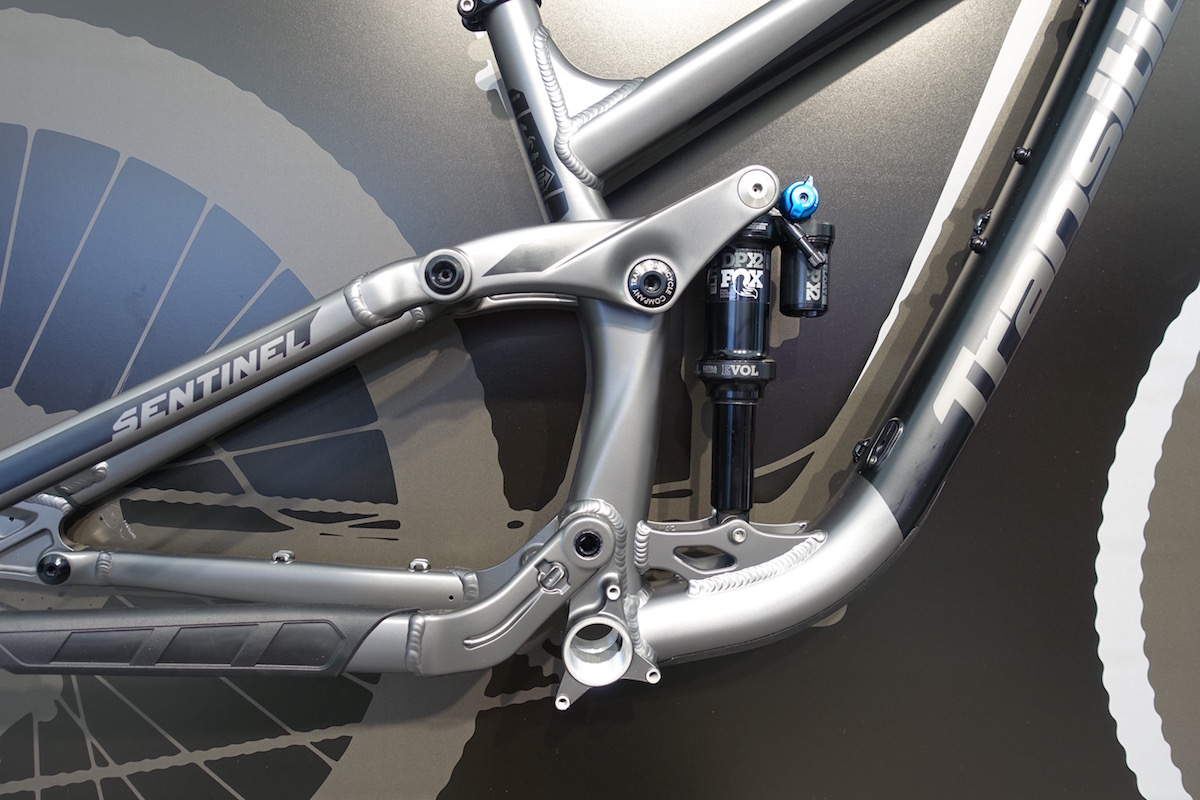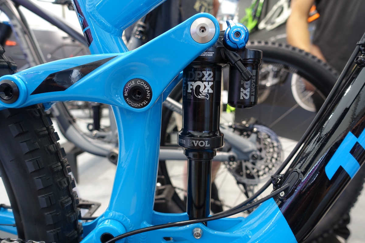 The new Sentinel 29er features 140mm of rear wheel travel and a four-bar suspension design dubbed the ‘Giddy Up Link’.All the new frames update to Boost 148x12mm spacing, with a Syntace X12 thru-axle locking down the dropouts.Transition’s Giddy Up link. Definitely not a horst link.You’ll find threaded bottom bracket shells and ISCG05 chainguide tabs on all the new full suspension trail bikes. Cabling is mostly external (boom!), except for a short run for the rear mech inside the chainstay, and the stealth dropper post line.Metric rear shocks have been implemented, with a Fox Float DPX2 shock watching over the Sentinel’s back end.For the bikes without RockShox shocks, the sag range is conveniently printed on the inside of the rocker linkage.The Sentinel is only available in an alloy frame. For now…Nice tapered head tube and an internal cable port for the stealth dropper post.A complete Sentinel decked out with E*13 wheels and a SRAM 1×12 drivetrain.All pivots are rolling on higher quality bearings, after Transition experienced issues with previous models.The Float DPX2 rear shock combines the ease of adjustment of the Float DPS shock, with the control of the bigger X2 shock.The new Smuggler also uses 29in wheels, but shrinks travel down to 120mm on the back, and 140mm on the front.Whilst not strictly brand new, this was the first time we’ve gotten a look at the new carbon trail hardtails from Transition.The Vanquish is a 29in hardtail with a 120mm travel fork, while the Throttle is a 27.5in hardtail built with a 140mm travel fork. Both frames are built with a full carbon frame.Look at the clearance on the rear tyre! That’s how you get a 420mm chainstay length while providing clearance for up to 2.4in tyres.Not a whole load of mud clearance…As you’d expect, the Vanquish and Throttle frames are 1x only. Rear hub spacing is 148x12mm, and the bottom bracket is a 73mm threaded number.They may be made of carbon fibre, but the Throttle and Vanquish are burly trail bikes at heart.