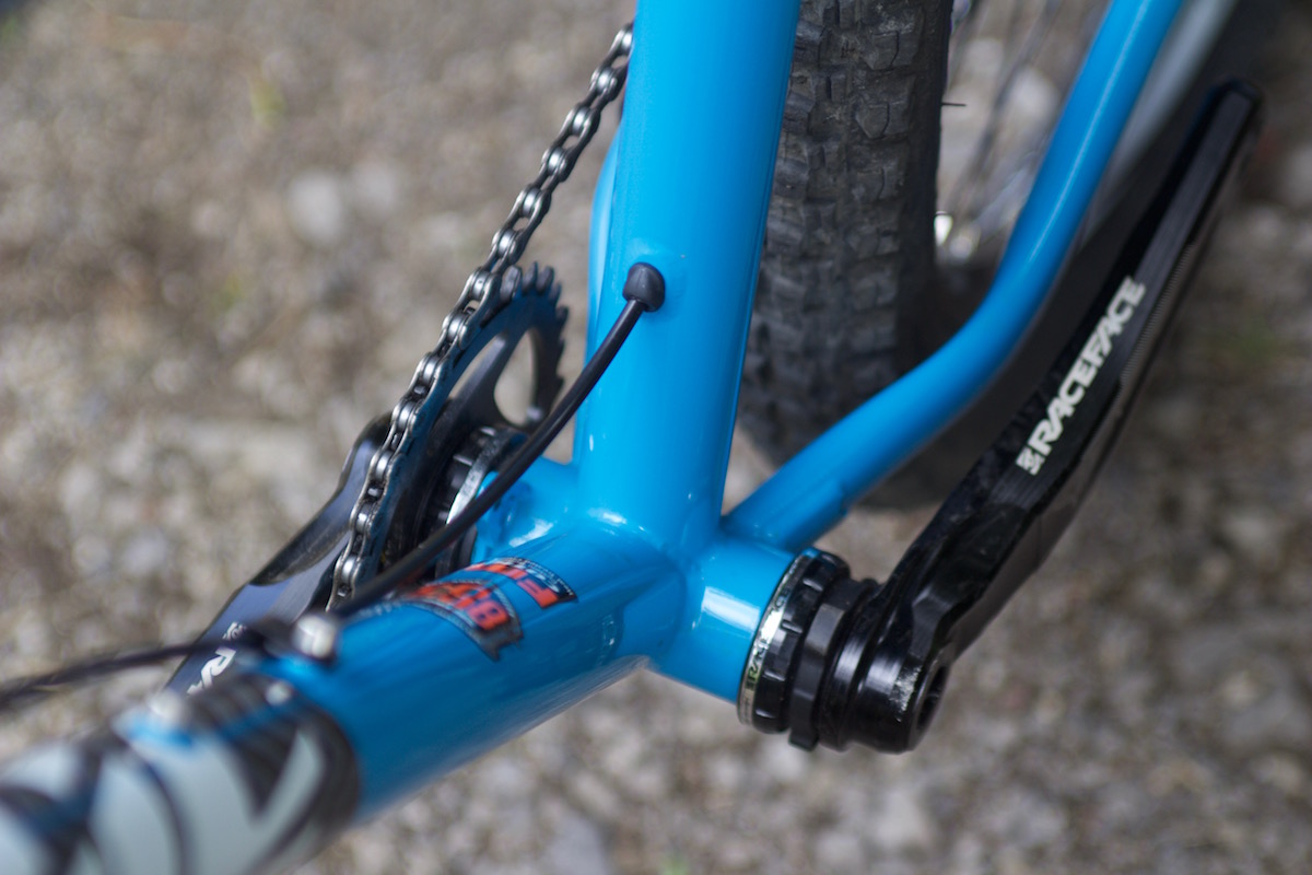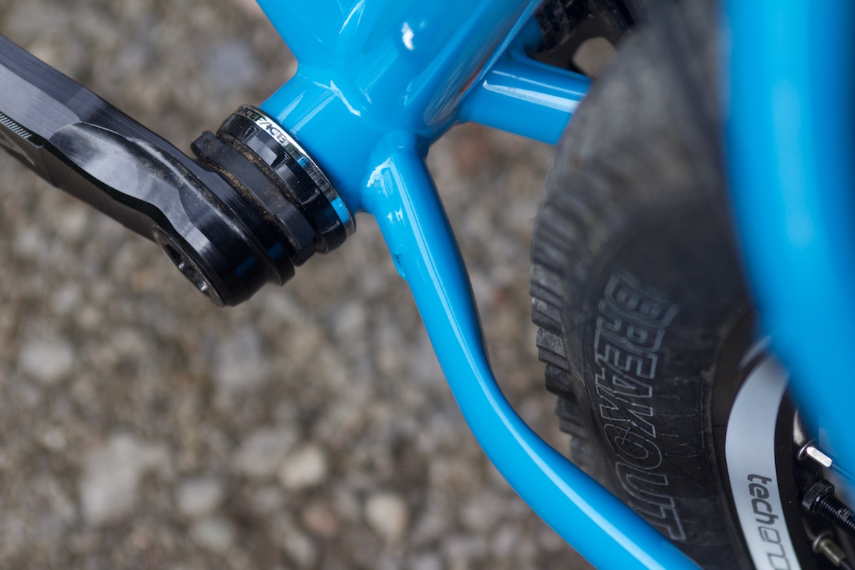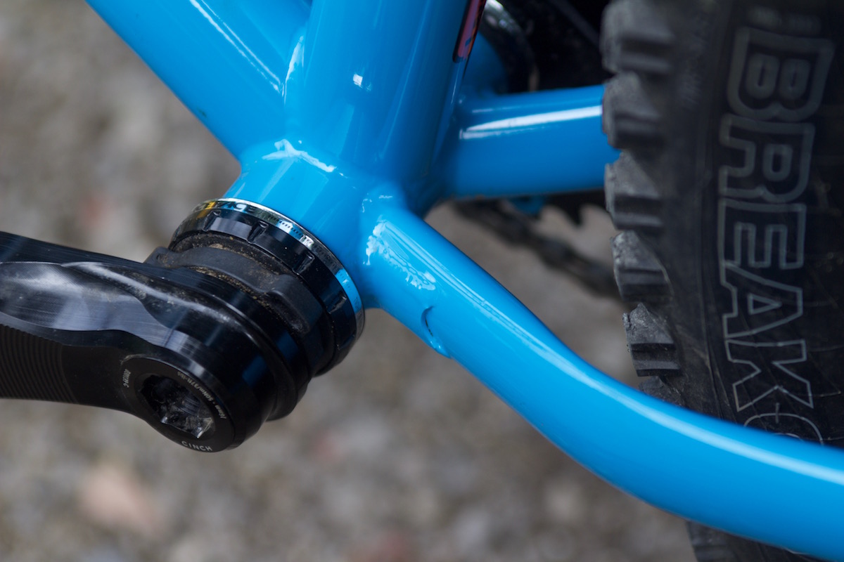 Note the neat little gussets on the outside of each chainstay tube where they meet the bottom bracket. Cotic was keen to ensure the BFe frame was sufficiently stiff through this area, despite the slender steel tubes and wide tyre clearance.