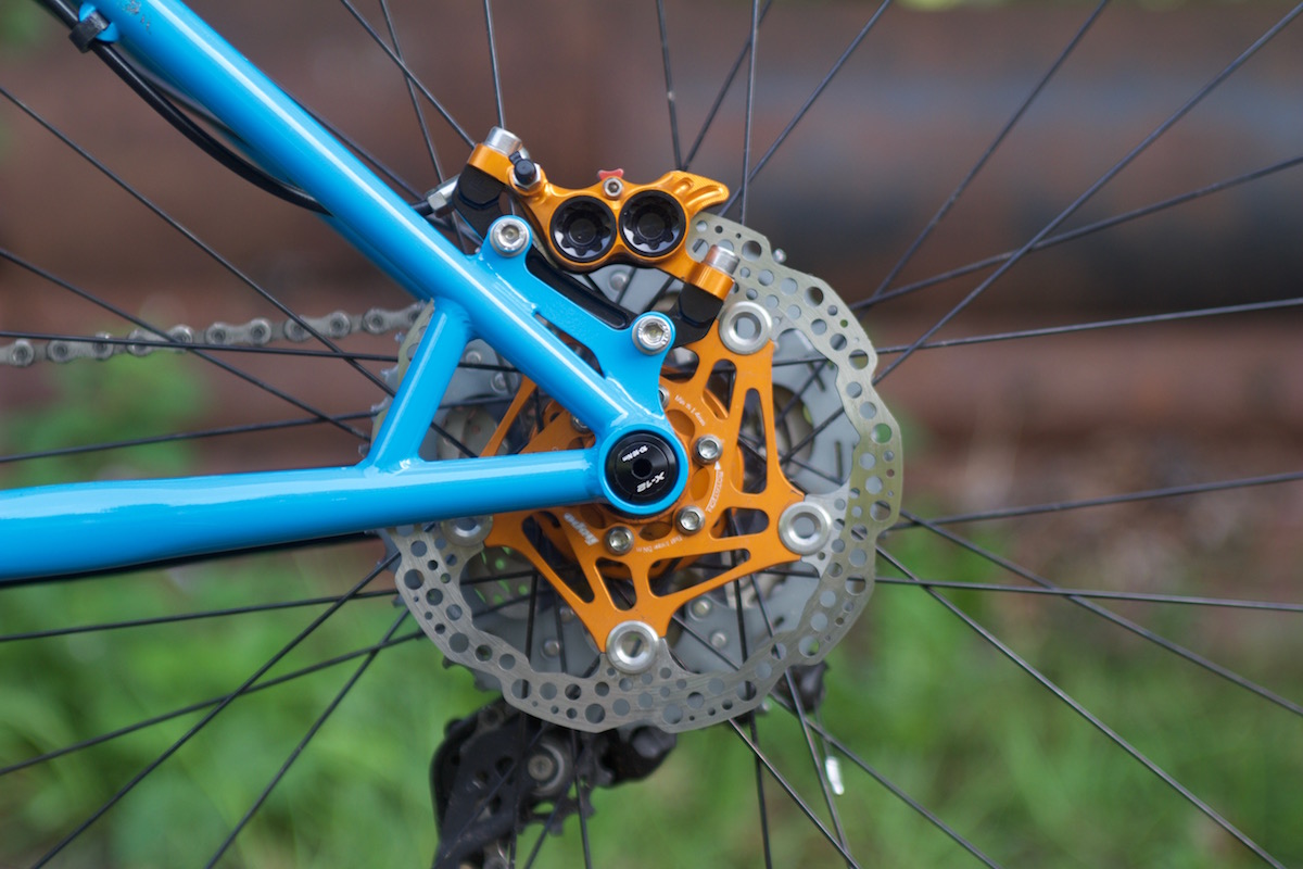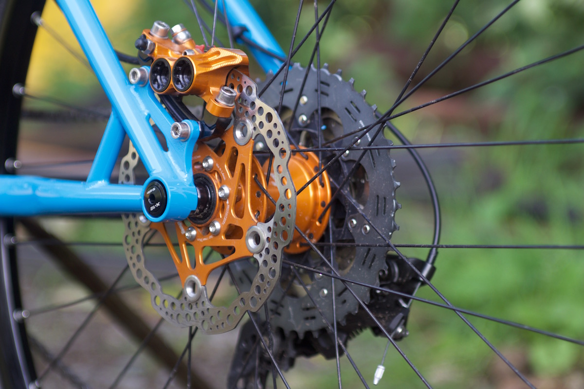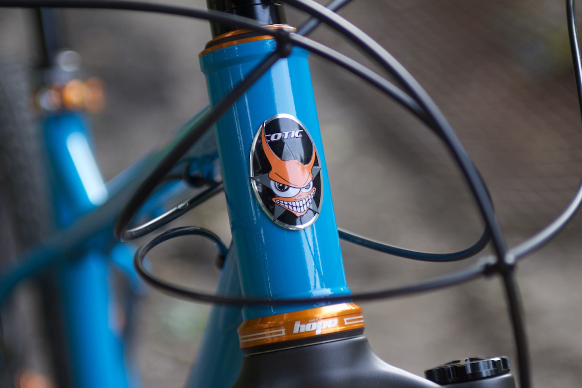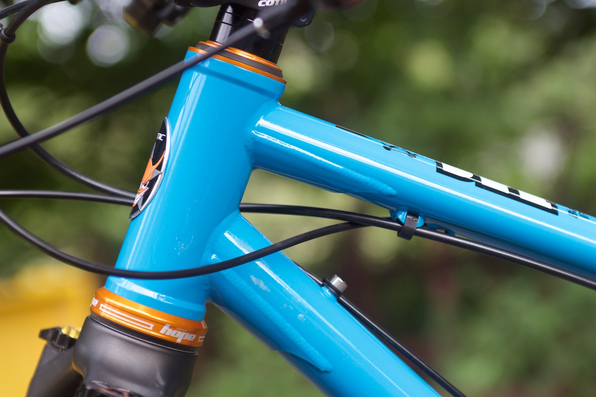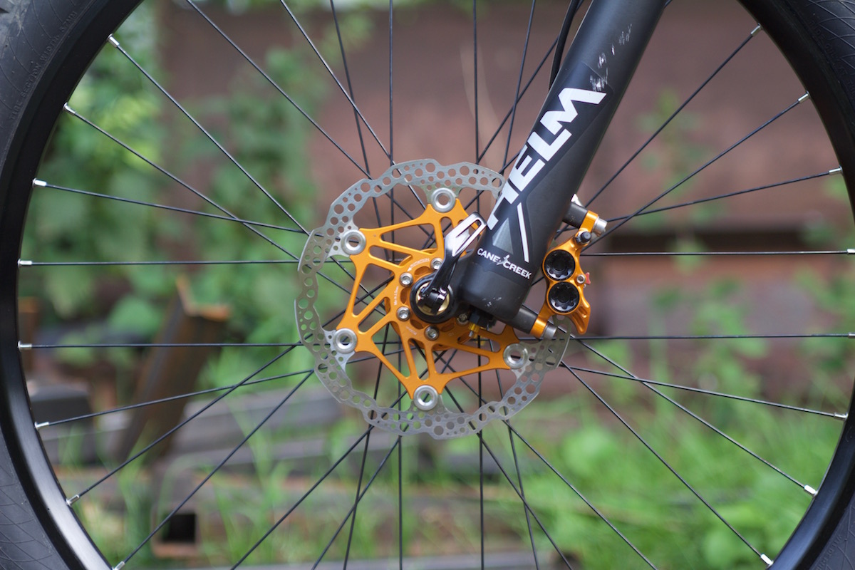 This test bike was built up with a smattering of gold anodized Hope components, including the Tech 3 E4 disc brakes and Pro4 hubs. Mmmm….
