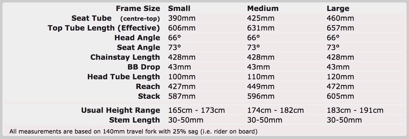 • 66° head angle (with 140mm travel fork, sagged at 25%)