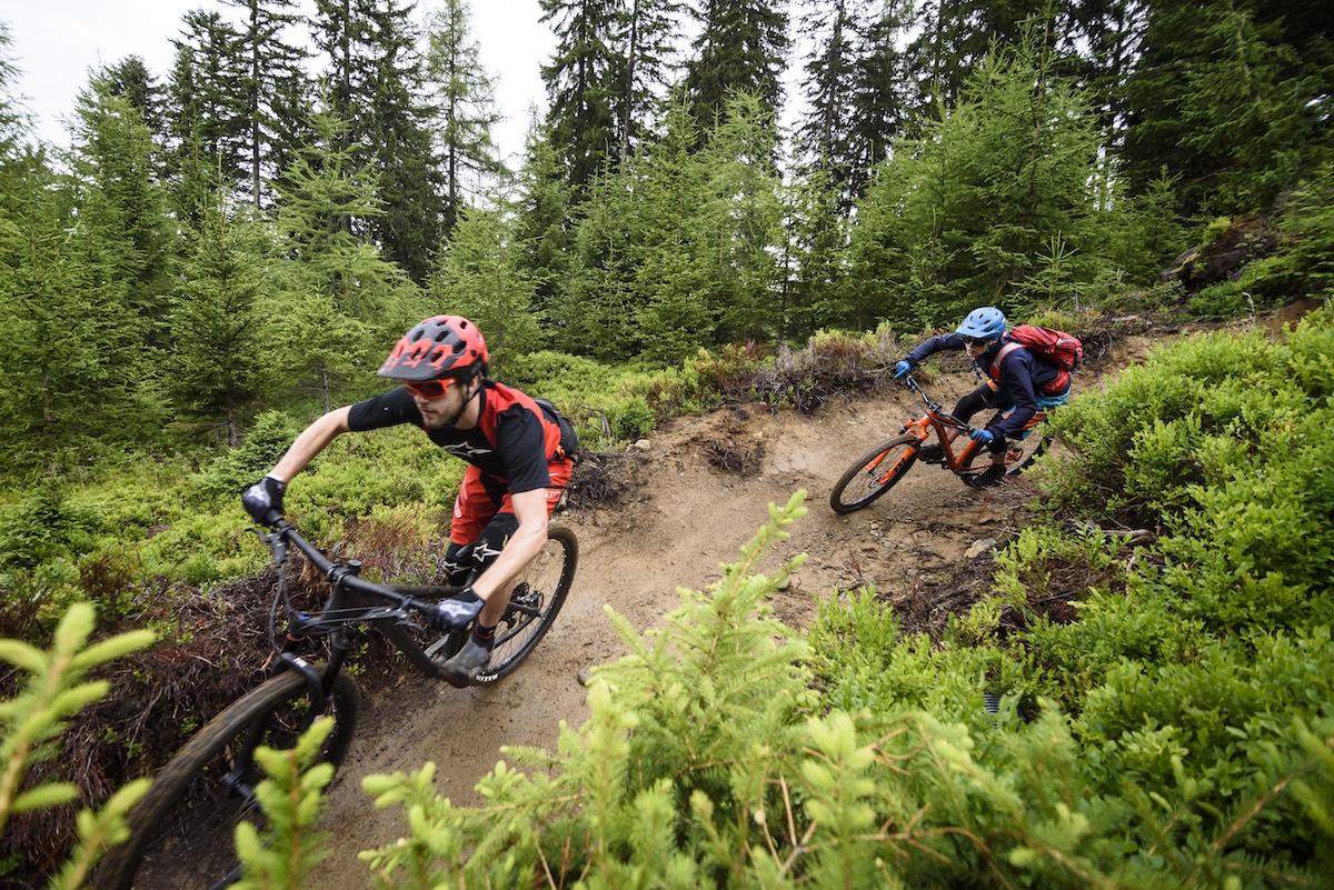 The gondola up to the next trail head doesn’t open until the week after we’re there, so we push up the gravel double track to the start. It’s a slog – not the kind of thing you really want to be riding a trail bike up. Definitely lycra and XC bike territory for those slow pulsed racing snakes. Even if the gondola isn’t open, it’s worth making the push at least once so as to experience the swooping berms of Auerhan Trail (500m descent in 2.5km) that head through the alpine meadow, with a distant view of the city as a backdrop. This trail leads into where the Crankworx Whip Off took place, and while the rest of the trail is rollable, here there are a few small gap jumps for the unwary.